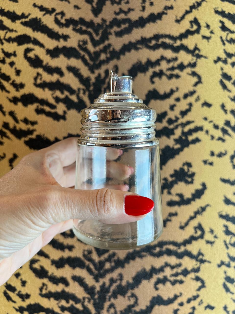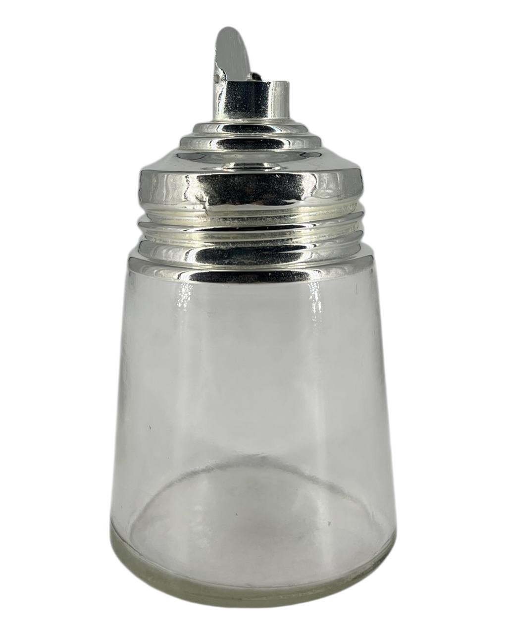 Açucareiro em vidro com um formato cilíndrico com uma base ligeiramente mais larga, conferindo estabilidade. Possui uma tampa de metal prateado com acabamento cromado na parte superior, que se enrosca no corpo de vidro.