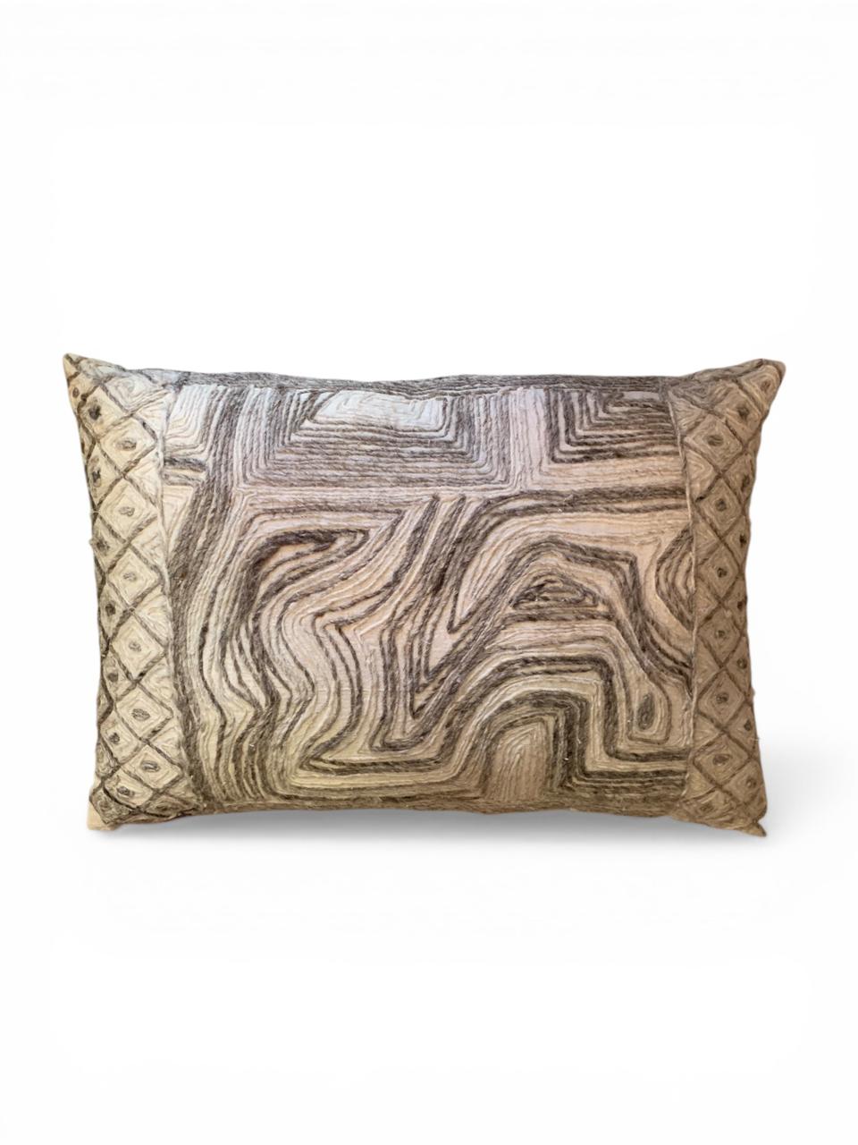 Uma peça que é puro movimento e textura. Esta almofada retangular destaca-se pelo seu intrincado trabalho de bordado em cordone, criando um padrão de linhas fluidas que remete a formações geológicas ou mapas topográficos. As laterais são finalizadas com uma moldura de padronagem geométrica em losangos, criando um contraste elegante entre o orgânico e o estruturado.
