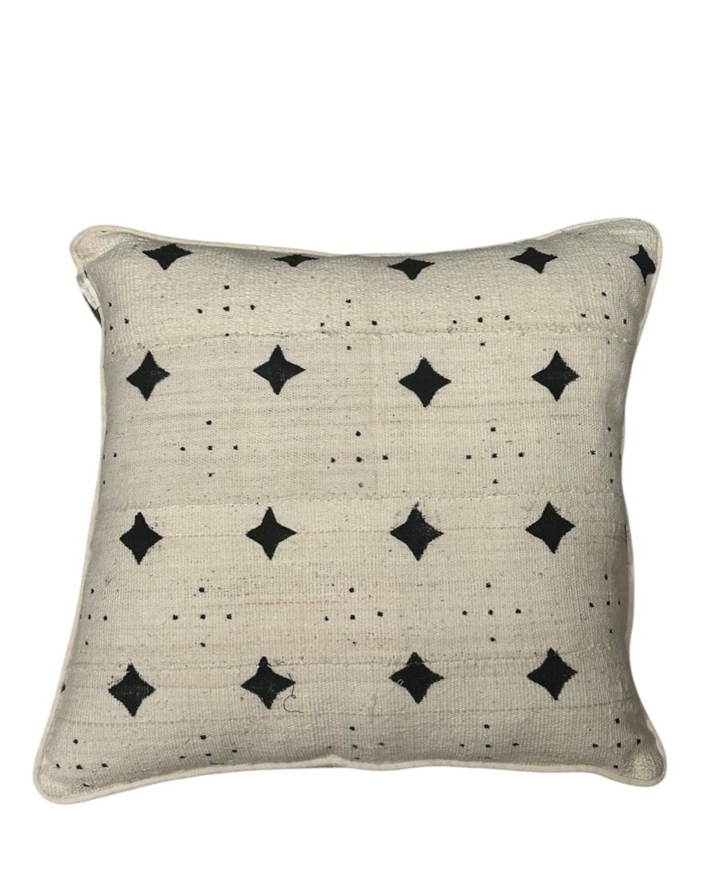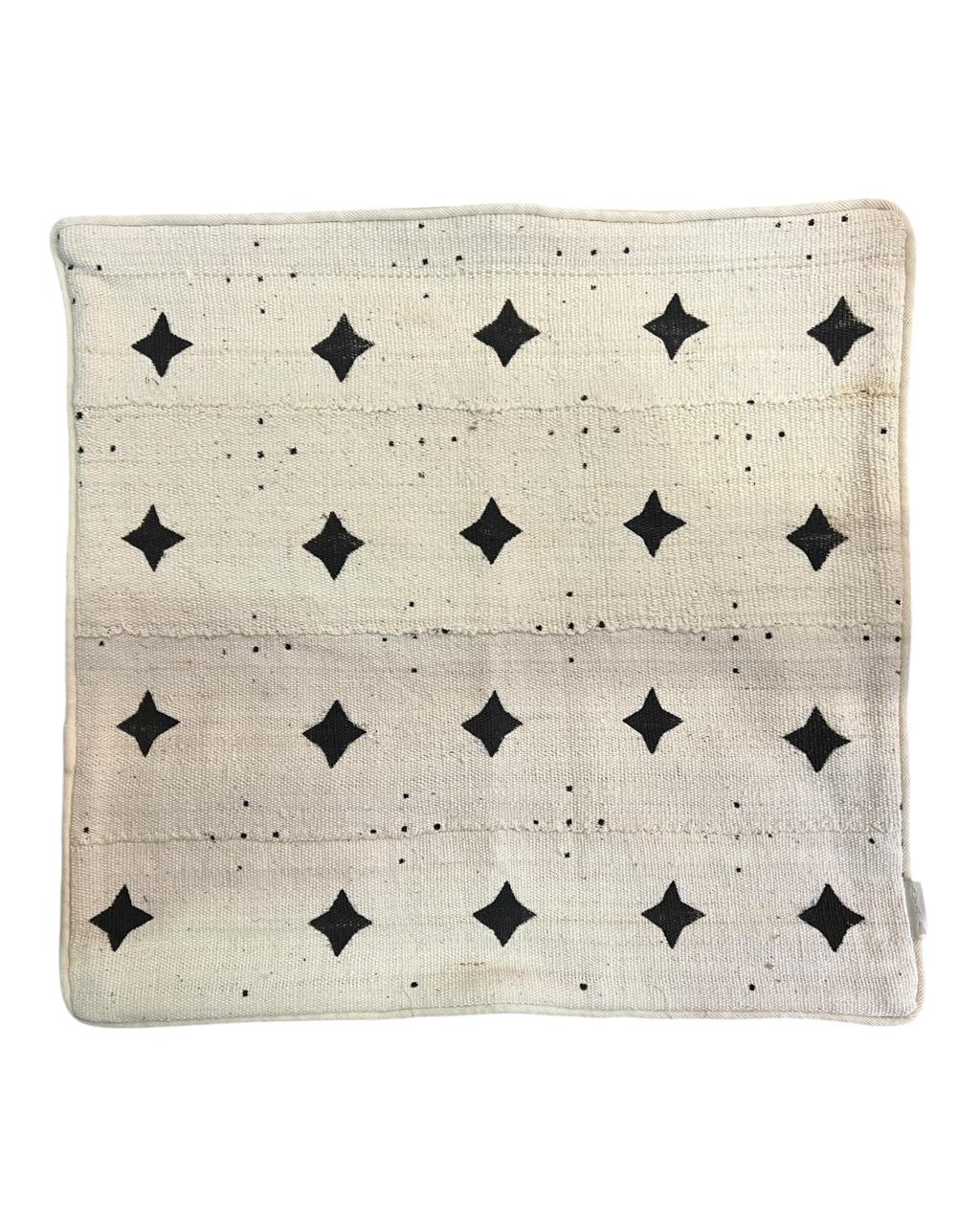 Almofada feita em tecido Bogolan, um tecido de algodão de origem malês feito à mão e tradicionalmente tingido com lama fermentada, símbolo da identidade cultural maliana. Com vivo, fundo off.