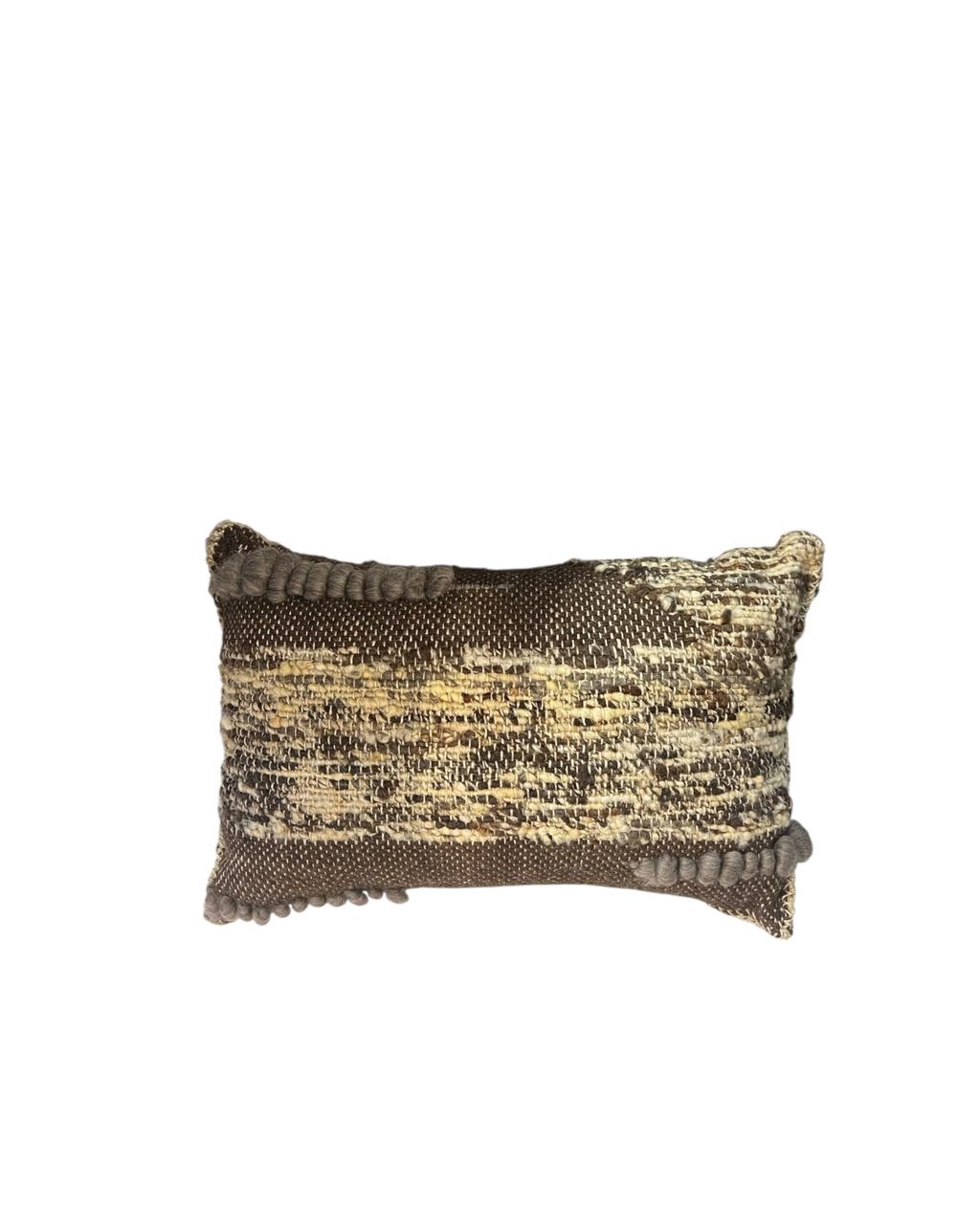 Adicione um toque de estilo rústico-chique e conforto imediato ao seu ambiente com esta deslumbrante almofada decorativa. A almofada possui uma textura rústica e um design artesanal, com faixas em tons de marrom escuro, bege e cru. As bordas são adornadas com pequenos pompons na cor marrom/cinza.