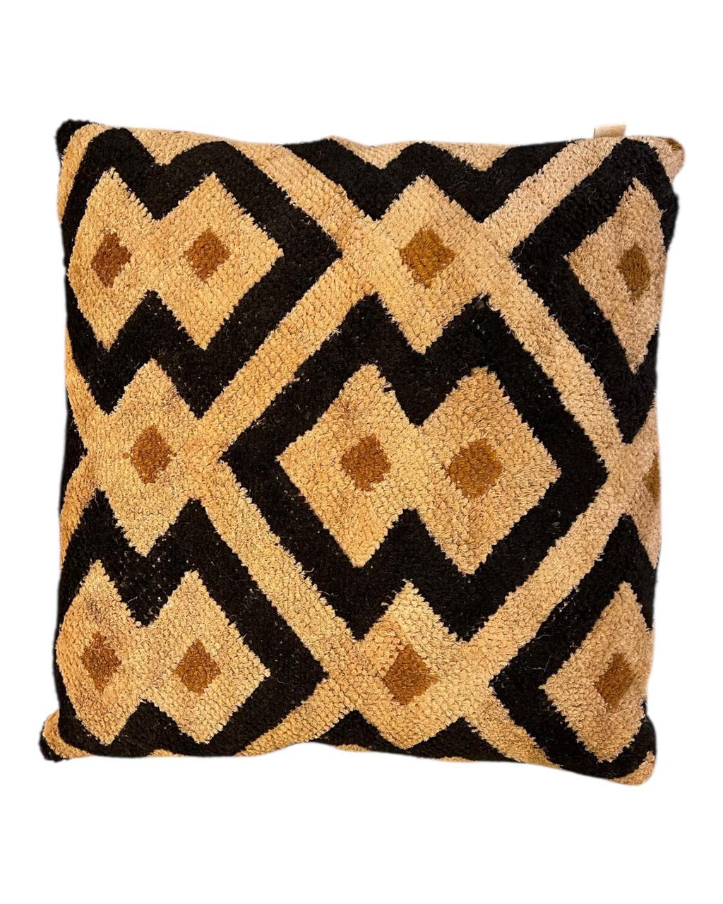 Almofada em tecido Kuba, tipo de têxtil tradicionalmente feito pelo povo Kuba da República Democrática do Congo, é caracterizada pelos seus padrões geométricos complexos e pela sua textura aveludada, frequentemente obtida através da aplicação de fibras de ráfia em técnicas de bordado e corte.