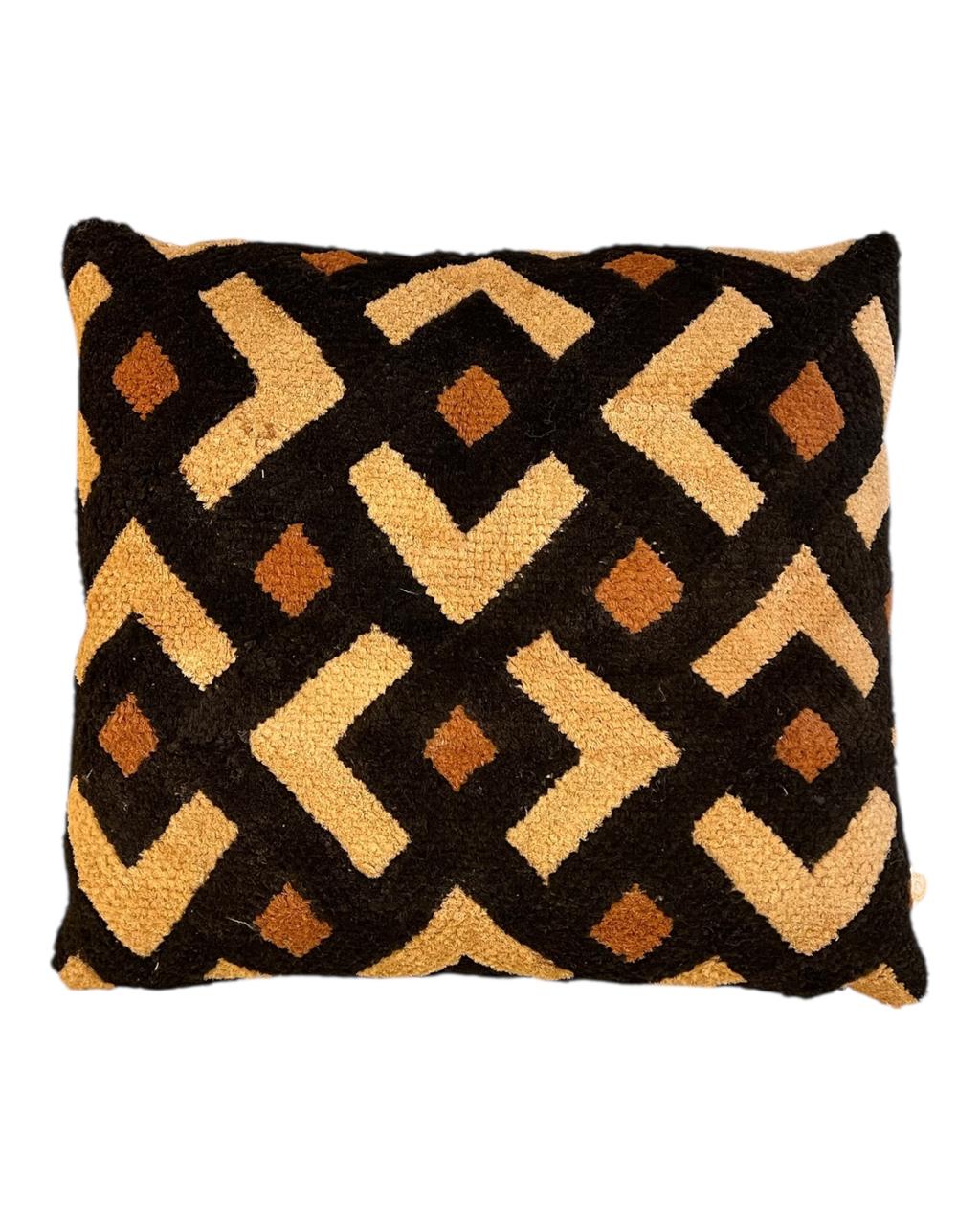 Almofada em tecido Kuba, tipo de têxtil tradicionalmente feito pelo povo Kuba da República Democrática do Congo, é caracterizada pelos seus padrões geométricos complexos e pela sua textura aveludada, frequentemente obtida através da aplicação de fibras de ráfia em técnicas de bordado e corte.