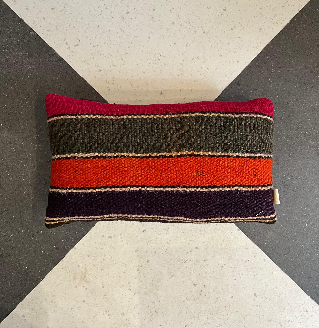 Perfeita para quem deseja dar vida e autenticidade à decoração. Seu design apresenta faixas horizontais em tons vibrantes de vermelho, laranja, preto e bege, criando um visual marcante que remete a padrões artesanais e culturais. O contraste entre as cores e a textura do tecido traz profundidade visual e um charme único ao ambiente. Além de funcional, essa almofada atua como elemento de destaque, valorizando espaços com estilo contemporâneo, boho ou étnico. Uma escolha perfeita para quem busca unir conforto, design e originalidade em um único item.
