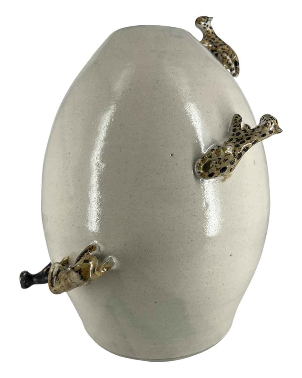 Anfora em cerâmica artesanal feita e pintada a mão de origem piauiense com felinos artesanais pela peça em forma de trilha subindo.