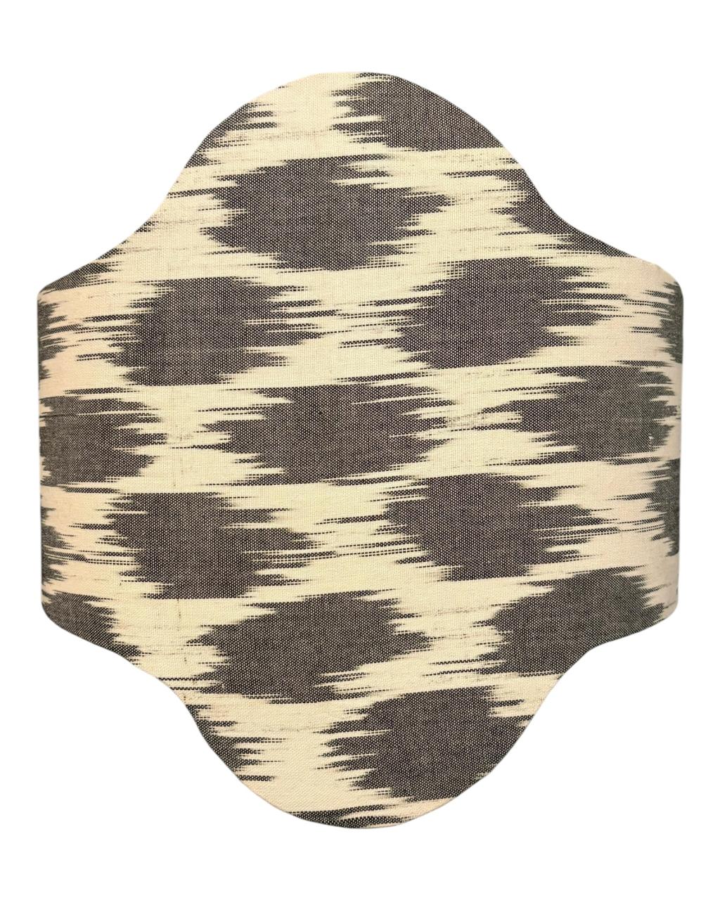 Arandela feita em tecido Ikat, feito através de um processo artesanal de tingimento por resistência, onde os fios de urdume (ou, em casos mais complexos, urdume e trama) são amarrados em padrões específicos e tingidos antes de serem tecidos. Após a amarração e o tingimento dos fios, eles são esticados no tear e tecidos. De origem uzbequistanês nas cor preta.