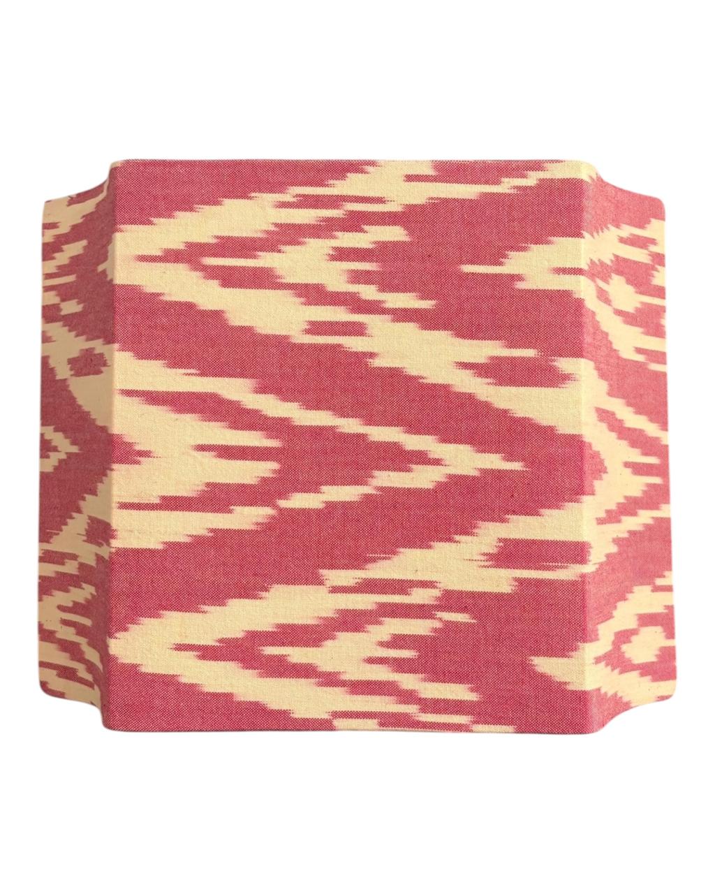 Arandela feita em tecido Ikat, feito através de um processo artesanal de tingimento por resistência, onde os fios de urdume (ou, em casos mais complexos, urdume e trama) são amarrados em padrões específicos e tingidos antes de serem tecidos. Após a amarração e o tingimento dos fios, eles são esticados no tear e tecidos. De origem uzbequistanês nas cor rosa.