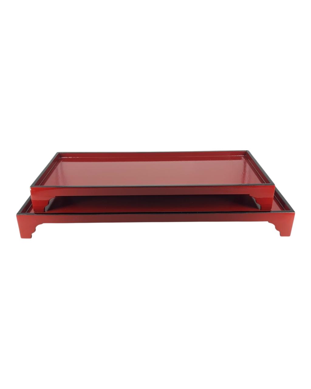 Esta bandeja é uma peça de destaque com um acabamento laqueado impecável, que confere um brilho espelhado e uma superfície perfeitamente lisa ao toque. A técnica artesanal da laqueação realça a beleza da peça, tornando-a ideal tanto para uso funcional quanto como um objeto de decoração sofisticado. As bordas e a base em laca preta proporcionam um contraste elegante e moderno, com linhas limpas e minimalistas, a bandeja se eleva sobre discretos pés, adicionando leveza e refinamento à sua estrutura.