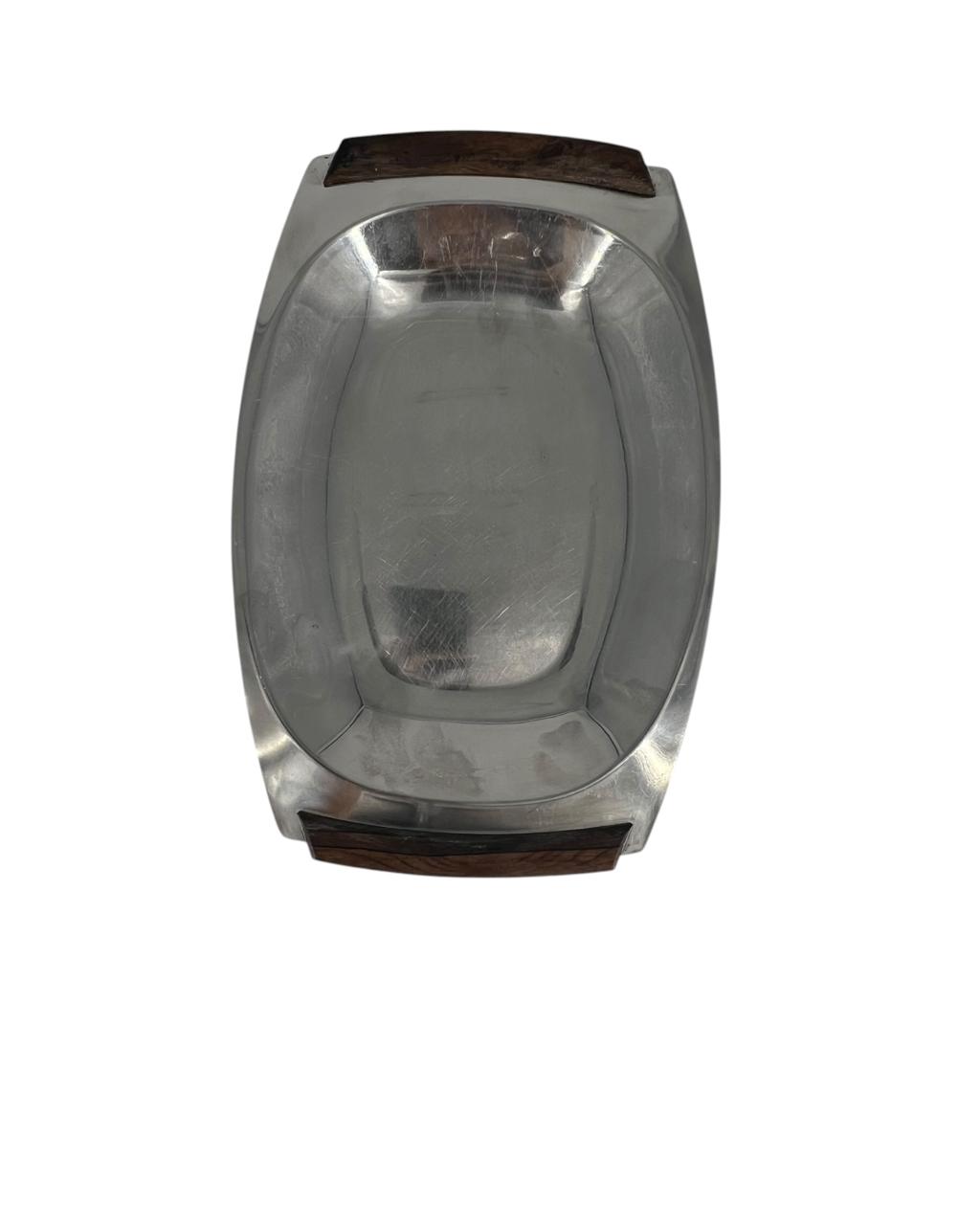 Bandeja vintage em aço inoxidável com alças em Jacarandá, uma peça elegante e funcional que encapsula o charme do design Mid-Century Modern. O contraste entre o brilho do aço inoxidável e o tom quente e rico da madeira de jacarandá. Perfeita para diversas ocasiões, desde refeições diárias até festas e reuniões especiais. Use-a para servir aperitivos, queijos, petiscos, pratos laterais ou sobremesas. É um item de colecionador versátil que agrega estilo único à decoração de qualquer mesa ou cozinha.