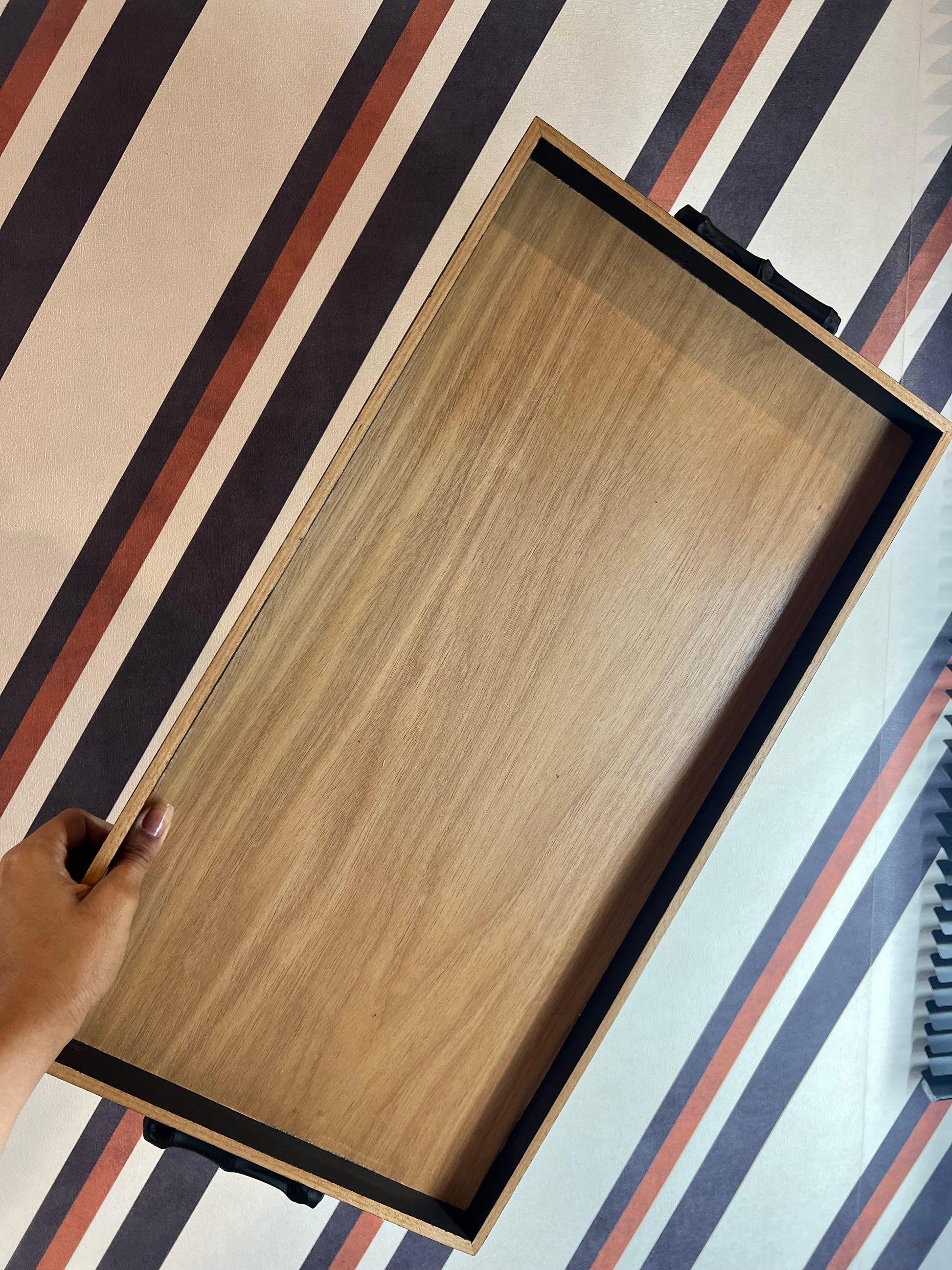 Essa bandeja decorativa combina elegância e funcionalidade para complementar qualquer ambiente. Produzida em madeira de alta qualidade, possui base em tom natural e bordas laqueada na cor preta que cria um contraste moderno e sofisticado. Seus pés elevados proporcionam estabilidade e um toque de charme extra, enquanto as alças laterais em bambu garante praticidade no manuseio.