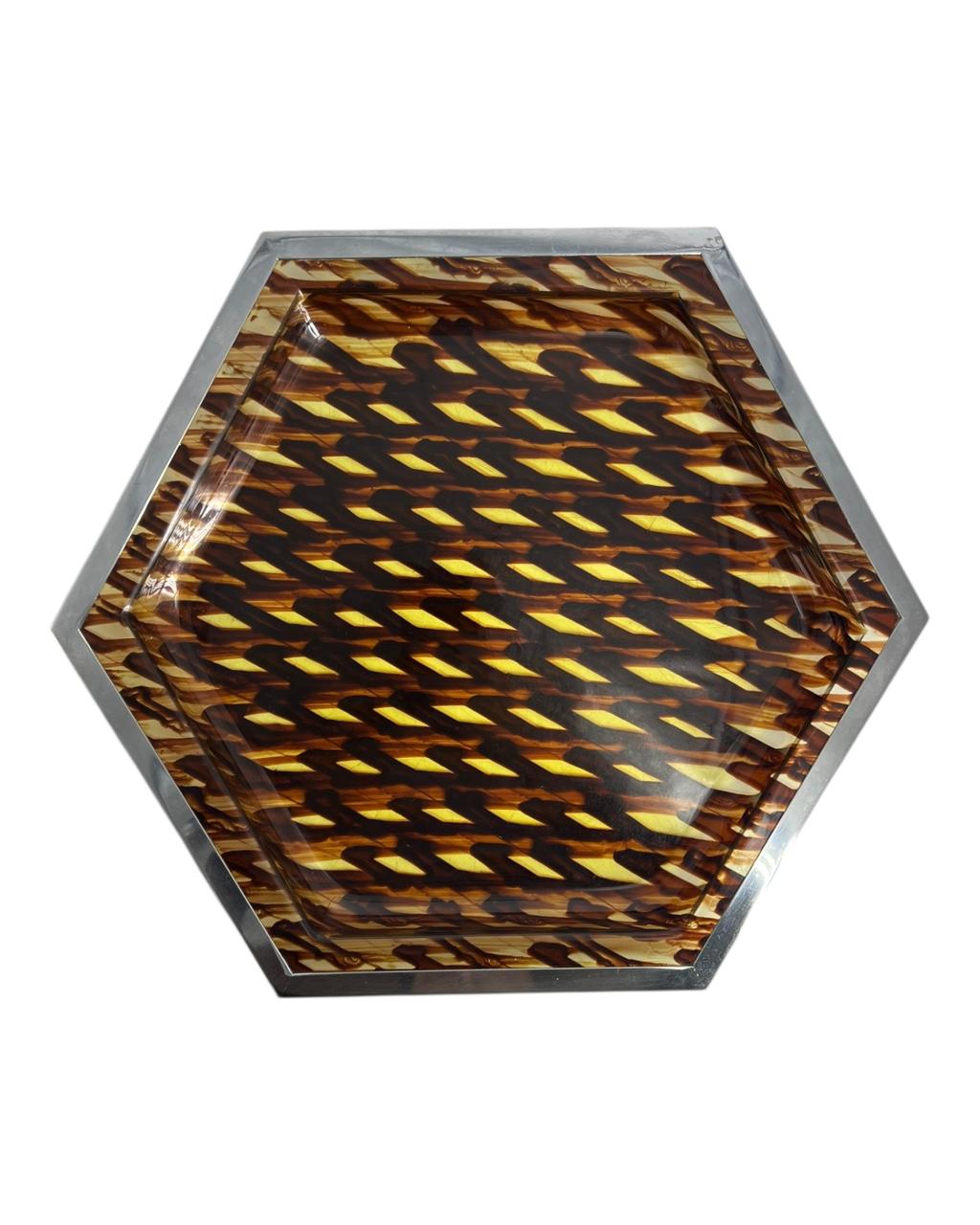 Bandeja sextavada (hexagonal) com um padrão detalhado que imita o casco de tartaruga, feita em acrílico garantindo durabilidade e um visual translúcido e profundo, com borda metálica que complementa o design, adicionando um toque de brilho e estrutura à peça.