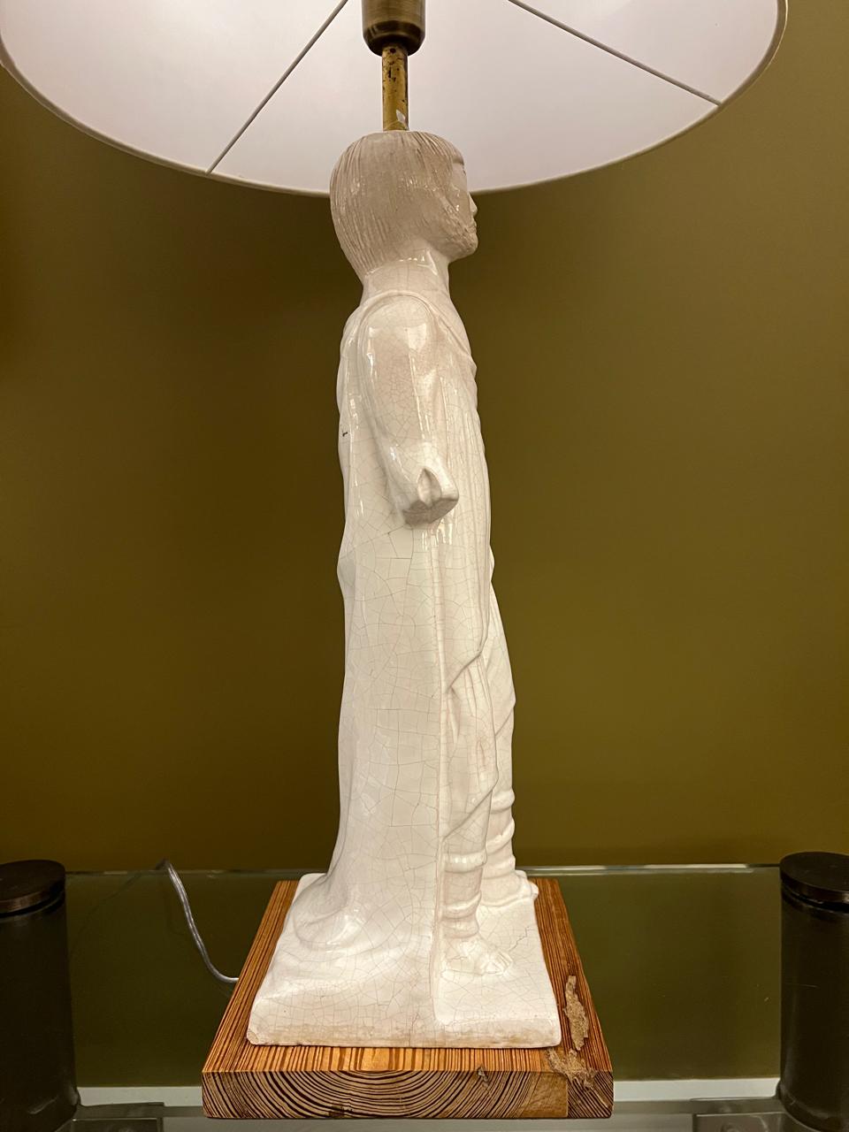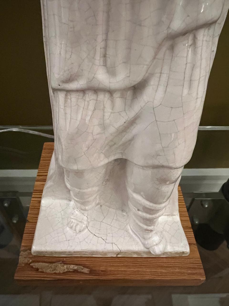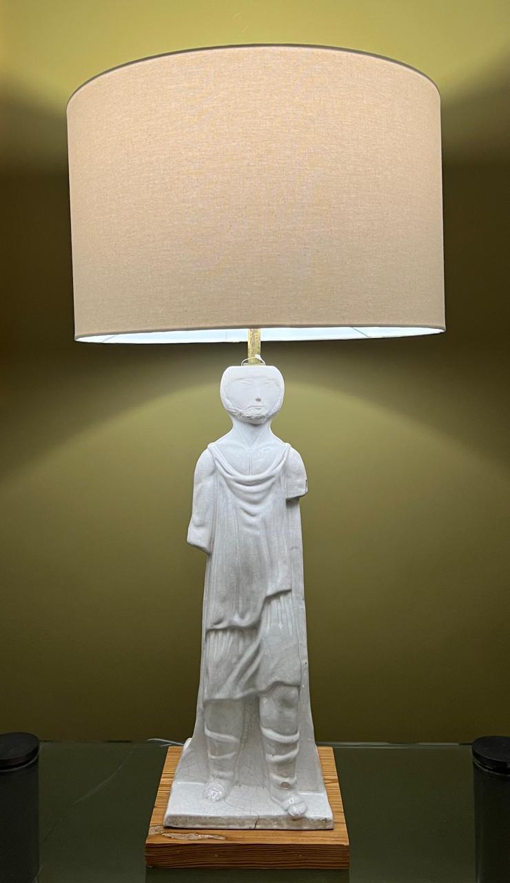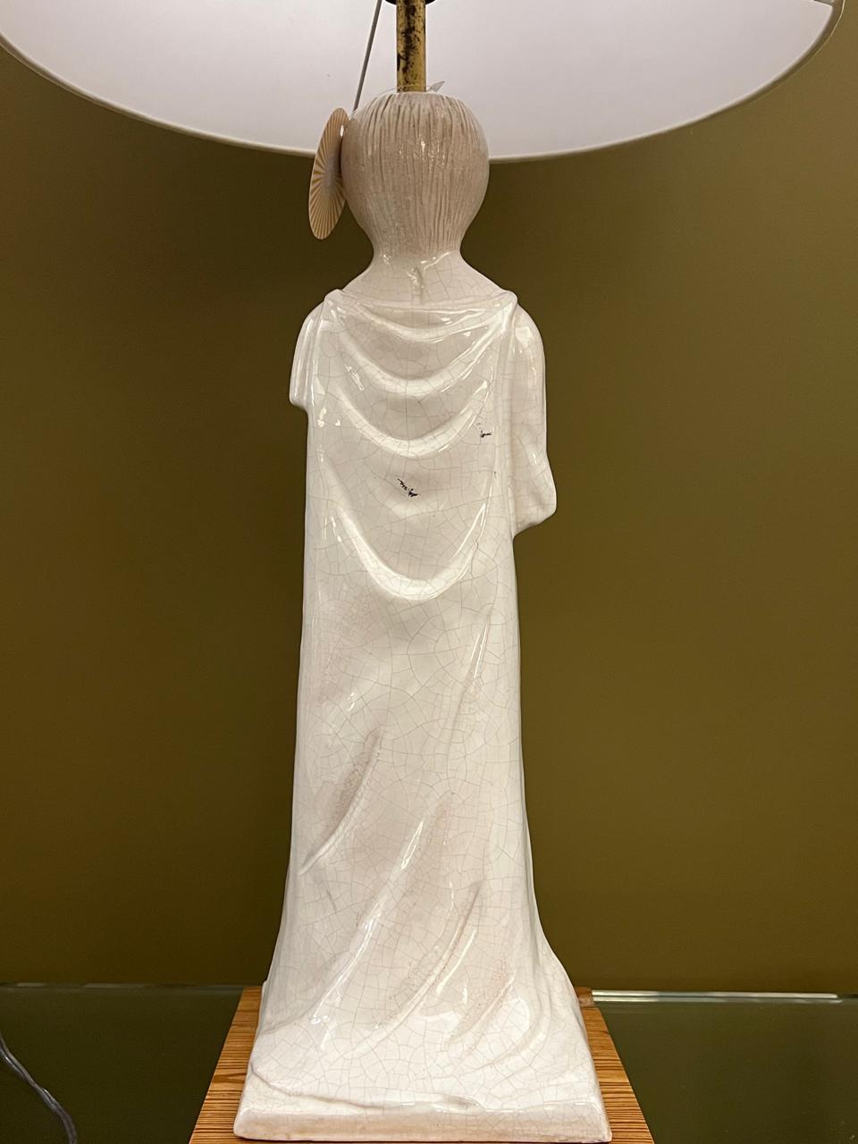 Este elegante abajur de mesa é uma peça de destaque com um toque vintage e artístico, a base é uma estatueta de porcelana craquelê, representando uma figura antiga que evoca a estética de esculturas orientais ou romanas. A estatueta em cerâmica branca representa uma figura humana em vestes antigas, com um detalhe intrigante e autêntico em sua forma.