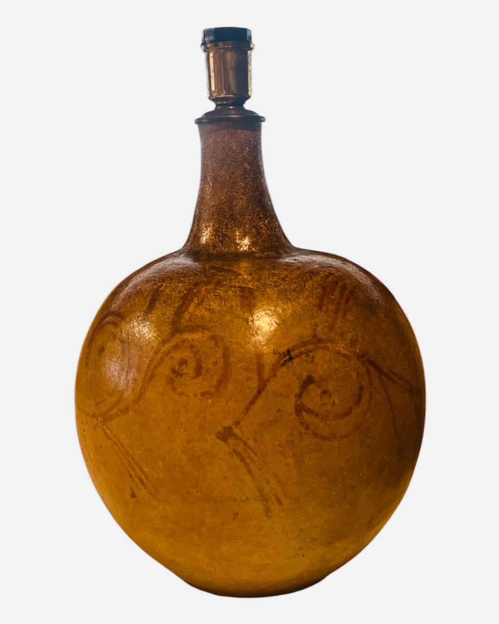 Base de abajur feita em cerâmica artesanal Saramenha, tipo de cerâmica de origem portuguesa produzido em algumas cidades brasileiras do estado de Minas Gerais, utilizando um barro escuro e queima feita a lenha, conhecida pela sua vitrificação com brilho especial e desenhos rústicos.