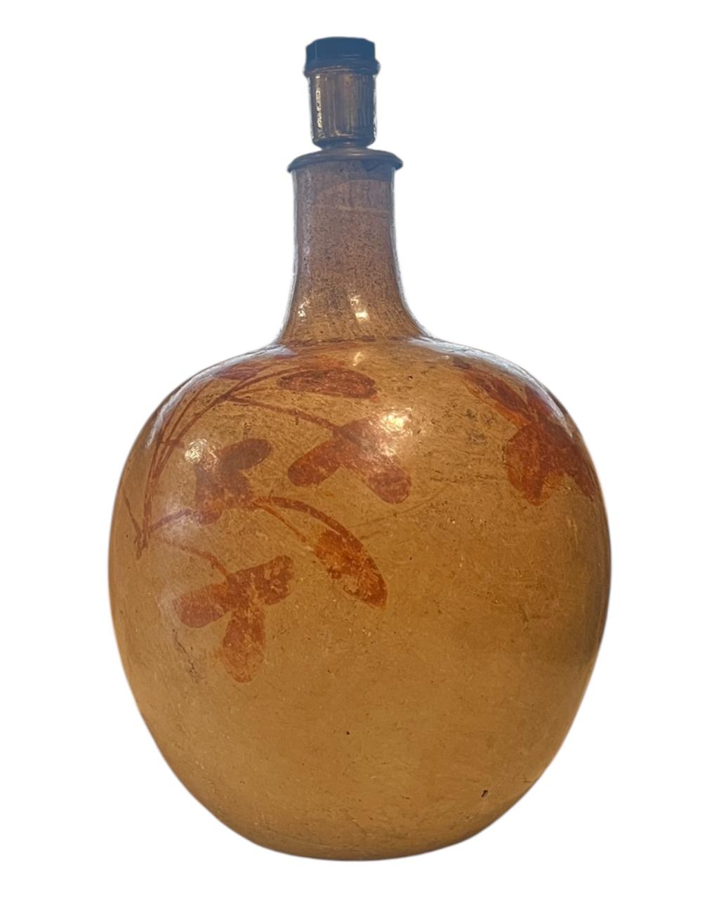 Base de abajur feita em cerâmica artesanal Saramenha, tipo de cerâmica de origem portuguesa produzido em algumas cidades brasileiras do estado de Minas Gerais, utilizando um barro escuro e queima feita a lenha, conhecida pela sua vitrificação com brilho especial e desenhos rústicos.