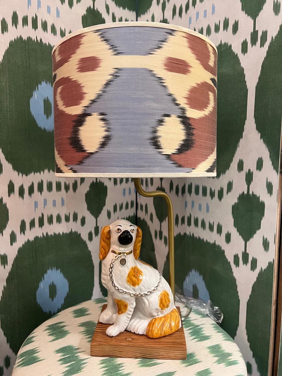 Esta é uma luminária de mesa inspirada nas clássicas estatuetas de cães da raça King Charles Spaniel, populares na Inglaterra vitoriana. Conhecidas como cães Staffordshire.