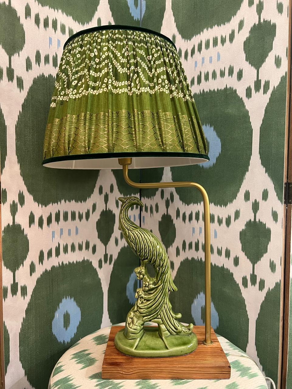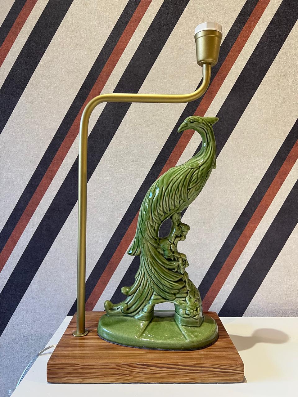 Adicione um toque de elegância e história à sua decoração com este deslumbrante abajur de mesa em estilo vintage. A peça central é uma figura de pavão ricamente detalhada, esculpida em cerâmica e finalizada com um esmalte verde brilhante, que reflete a beleza e a exuberância da natureza.