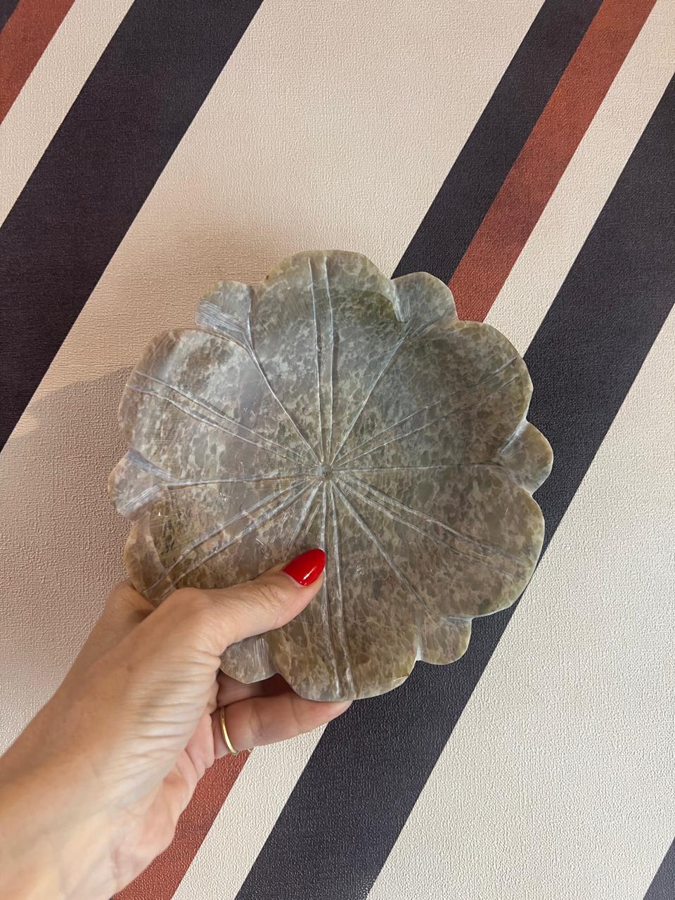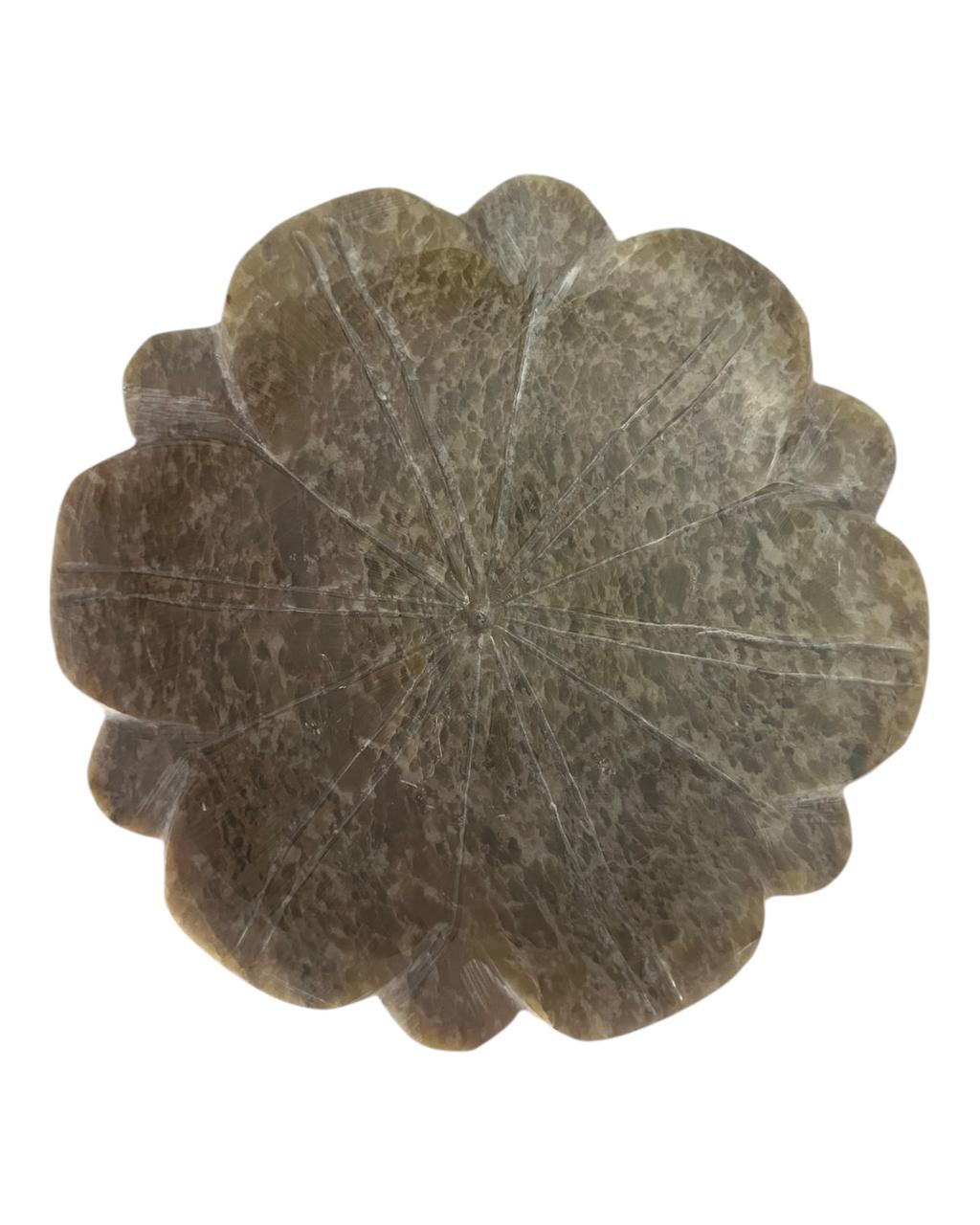 A peça é feita de pedra-sabão (ou esteatito), uma rocha macia e de fácil manipulação, encontrada em abundância no estado de Minas Gerais. Sua cor é um tom neutro e natural, que pode variar entre cinza-claro, verde-oliva e marrom, com veios ou manchas características da pedra. A superfície é lisa e polida, destacando a textura suave e fosca do material. O design imita uma flor de lótus, um símbolo de pureza e beleza na natureza. Pode servir como uma pequena tigela para guardar joias, chaves, pequenos objetos ou até mesmo servir petiscos, como nozes e amendoins. Funciona como um belo item decorativo, adicionando um toque artesanal e natural a qualquer ambiente.