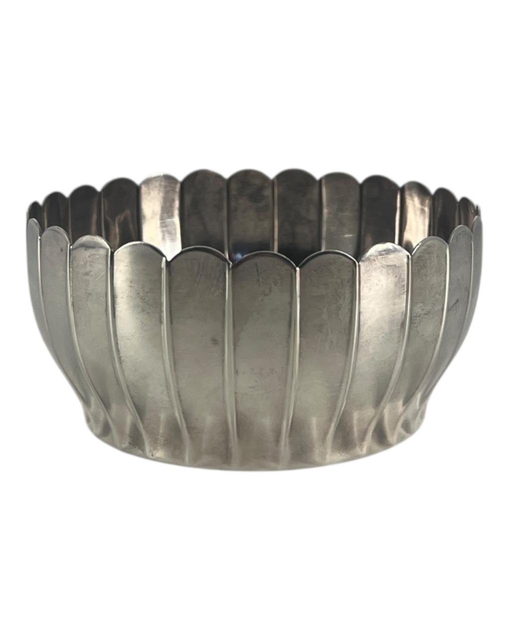 O bowl apresentado na imagem é uma bowl decorativo de prata com corpo gomado ou canelado, remetendo a um design vintage. O formato de suas bordas recortadas, semelhantes a conchas ou vieiras ("scalloped"), é uma característica distintiva do seu estilo.