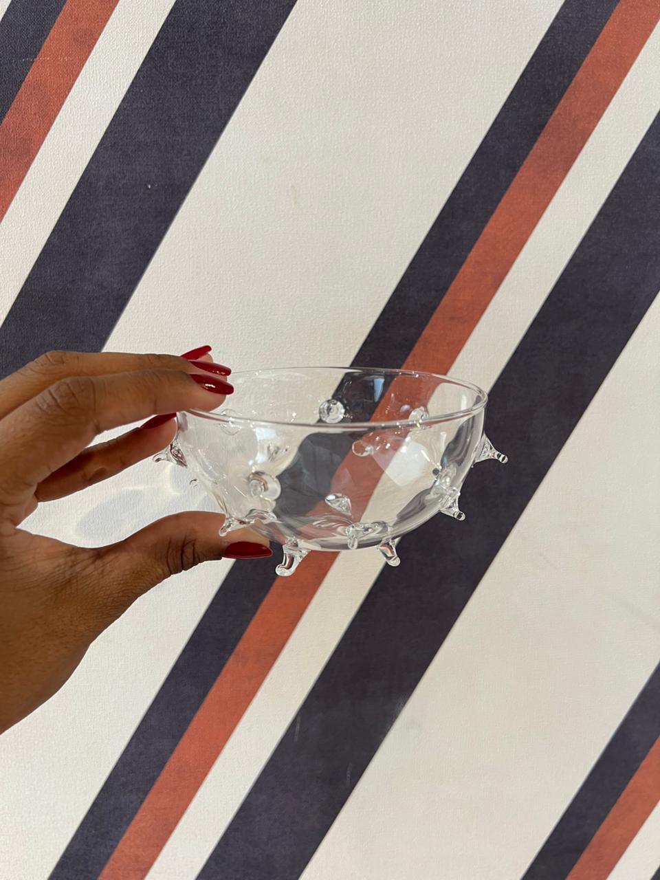 Este bowl de vidro é uma peça de design cativante, ideal para adicionar um toque de originalidade à sua mesa ou decoração. O design é frequentemente descrito como "ouriço-do-mar" ou "oursin" (em francês) devido às suas distintas protuberâncias pontiagudas, que lembram as do animal marinho. Inspirado na natureza, o bowl apresenta uma estética moderna e escultural. As saliências não só adicionam interesse visual, mas também oferecem uma textura tátil única.