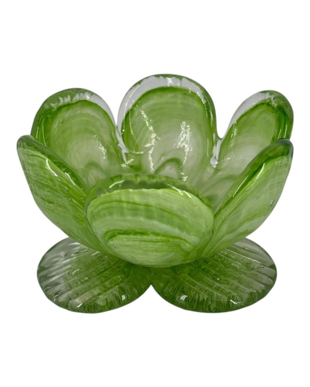 Adicione um toque de elegância e sofisticação à sua decoração com este bowl em vidro verde, no autêntico estilo Murano. Feito artesanalmente através da técnica de sopro, cada peça possui um design orgânico e exclusivo, com bordas onduladas que lembram delicadas pétalas de flores. A tonalidade vibrante de verde, mesclada com sutis veios brancos, cria um efeito visual encantador.