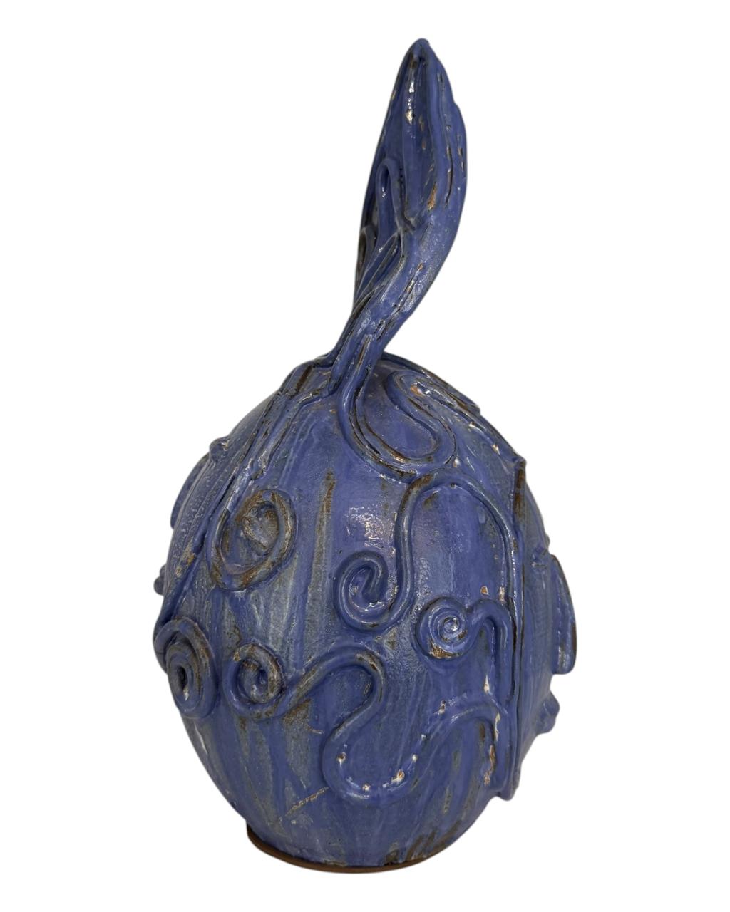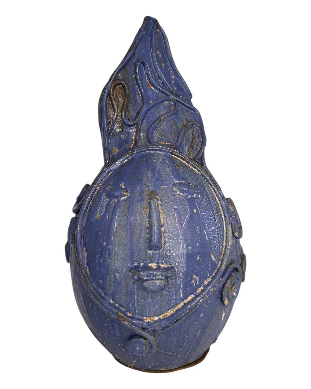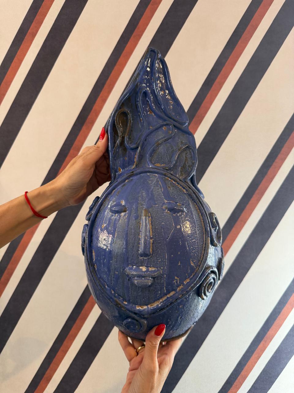 Esta peça única é uma verdadeira expressão artística que une formas orgânicas e simbologia espiritual. Esculpida à mão e finalizada em tons profundos de azul com leves toques envelhecidos, representa a conexão entre o humano e o divino.