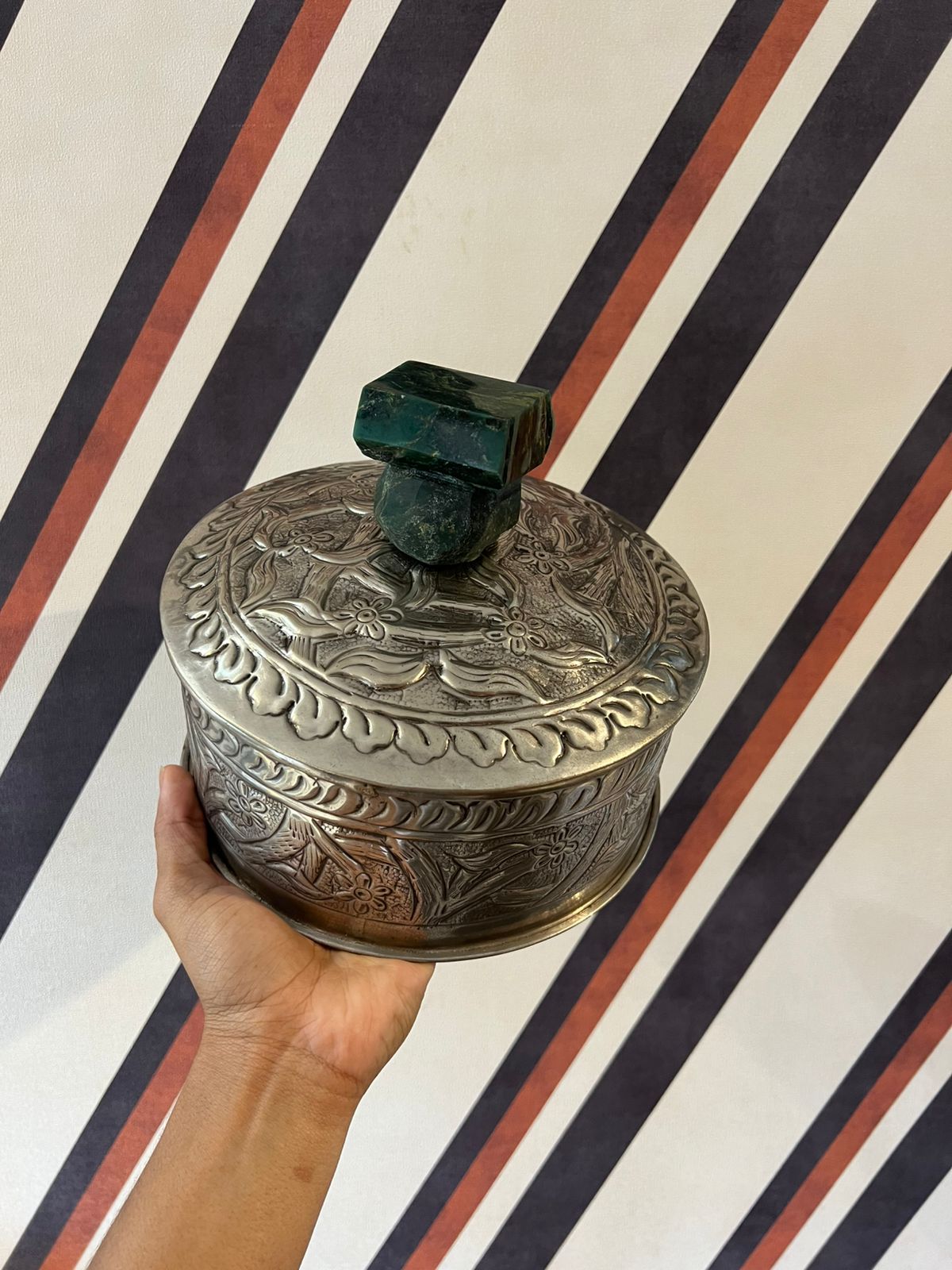 Descubra o equilíbrio perfeito entre a arte do metal e a mística de uma das pedras mais preciosas do mundo. Esta caixa decorativa é uma peça de destaque, ideal para quem procura um objeto que combine requinte artesanal com o simbolismo milenar da pedra Jade, conhecida pela sua textura sedosa e tons de verde que variam do translúcido ao profundo. É uma pedra que exala sofisticação e calma.