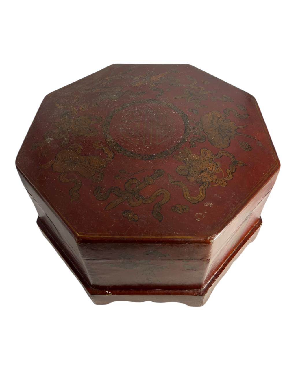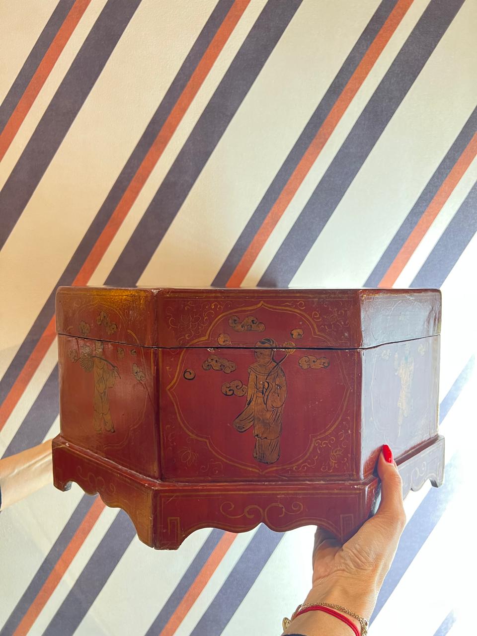 Caixa em laca octogonal chinesa, pode ser utilizada como um baú ou caixa de joias, destacando-se pela sua forma octogonal e a cor vermelha vibrante, um tom que era primário na laca chinesa, juntamente com o preto. A laca é uma resina natural com acabamento liso e resistente, usada na arte e decoração chinesa desde 6.000 a.C..