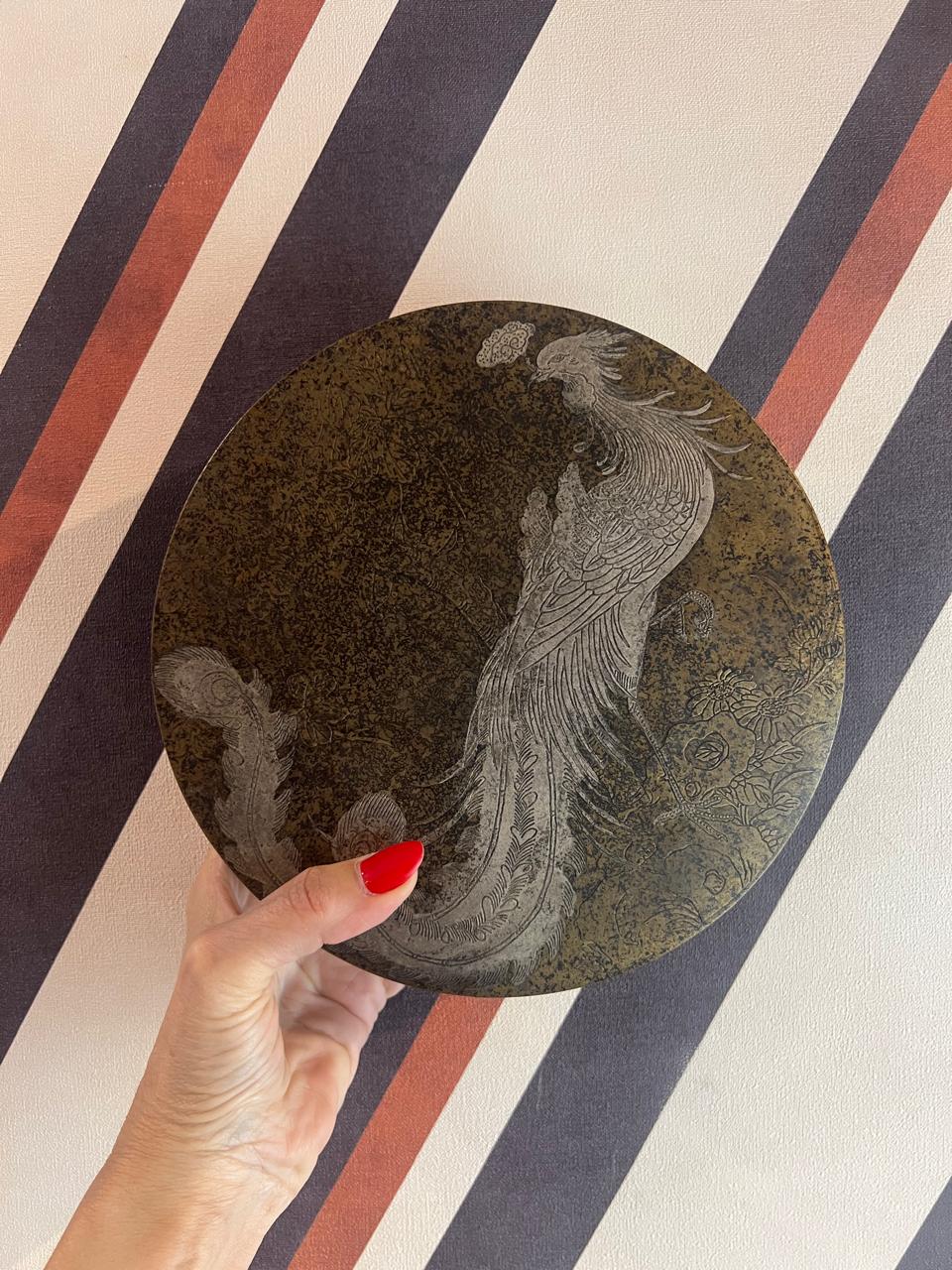 Caixa de metal com a representação de um pavaõ. O objeto possui uma pátina escura e o desenho do pavão é gravado em metal prateado, com detalhes em gravura.