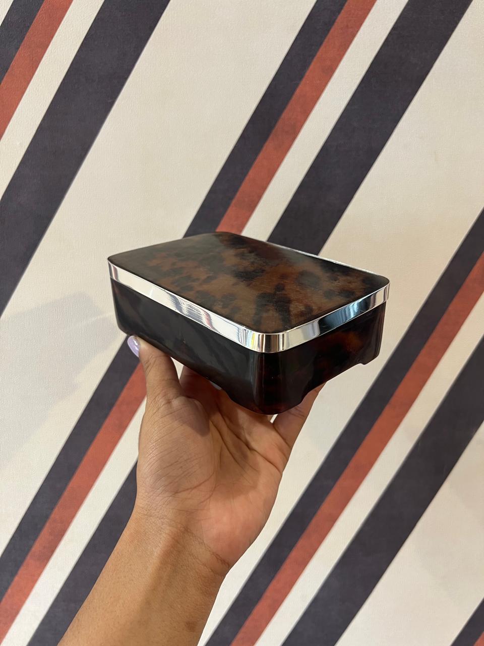 Caixa decorativa em acabamento escuro com design elegante e sofisticado, destacada por aplicação superior em formato de tartaruga com detalhes em prata que acrescentam brilho e requinte à peça. O contraste entre o tom profundo da caixa e o metal reluzente valoriza seu aspecto ornamental, tornando-a ideal para guardar pequenos objetos, joias ou compor a decoração com estilo distinto. Um item decorativo de forte presença visual, perfeito para ambientes clássicos ou coleções especiais.