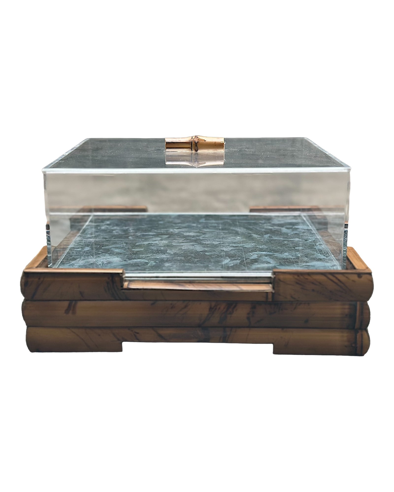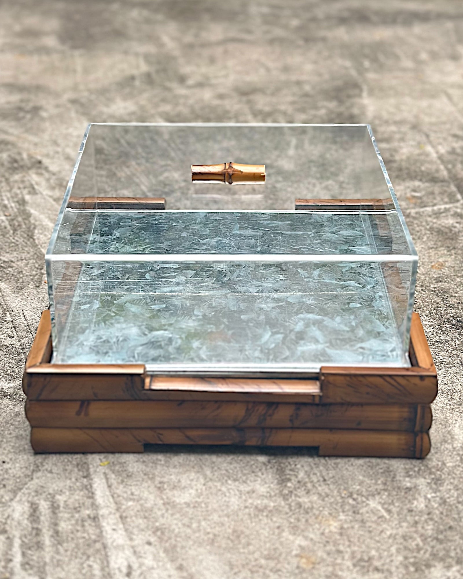 Caixa térmica para frios feita com a base e puxador em bambu e tampa em acrílico, mantendos os frios frescos.