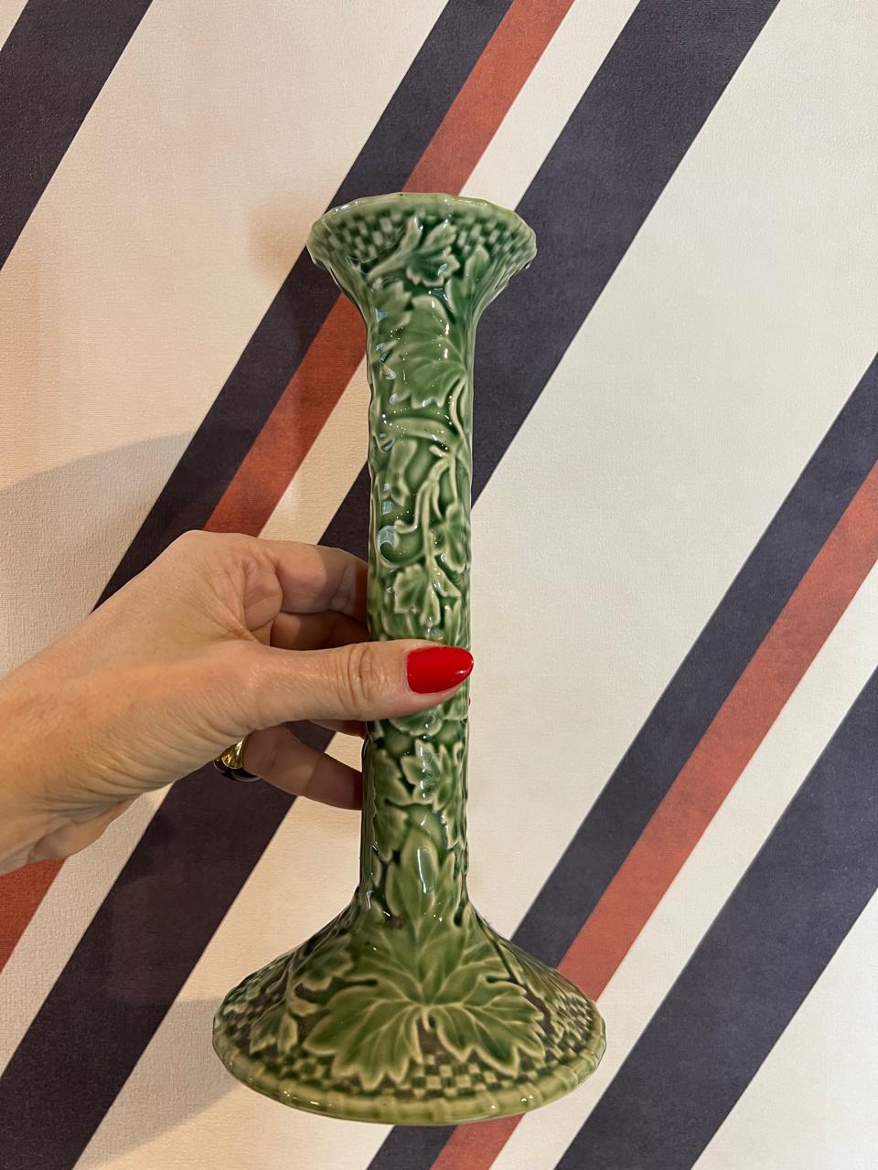 É um castiçal de cerâmica verde em majólica, caracterizado por um design em relevo de folhas de hera ou videira que cobrem toda a sua superfície, desde a base até o bocal superior. O padrão de hera ou videira em relevo é um estilo clássico de majólica, que imita a textura e os detalhes das folhas.