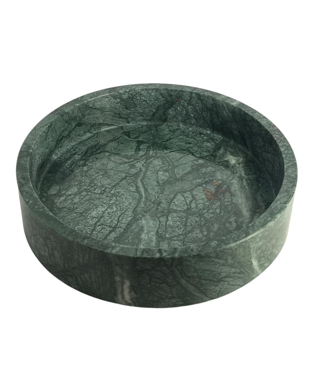 Centro de mesa em mármore verde, frequentemente chamado de verde Guatemala ou Verde Alpi, uma pedra natural com variações de tons e veios únicos.