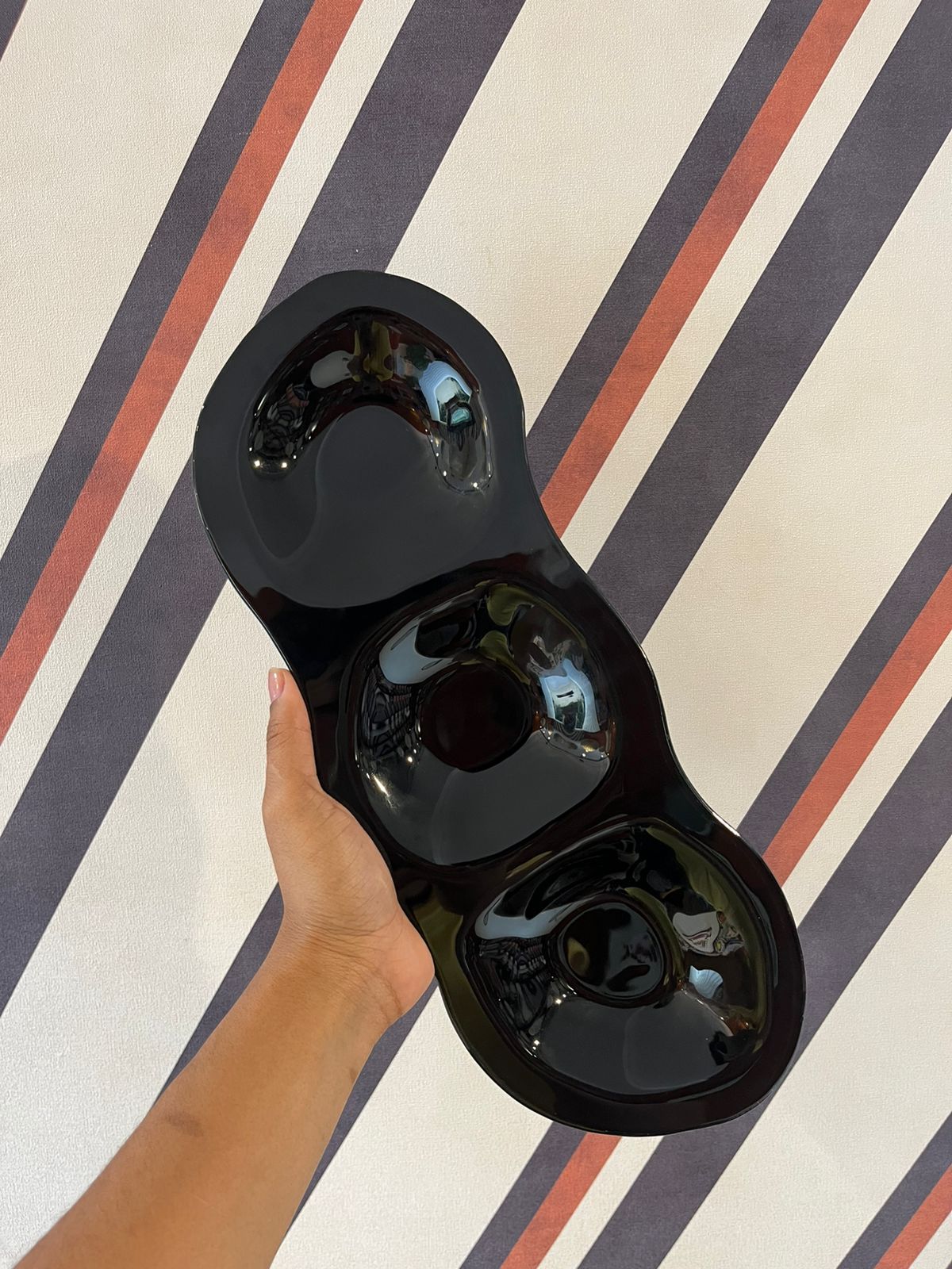 Petisqueira de design moderno e formato orgânico, com acabamento preto brilhante que confere elegância e sofisticação. Possui três divisórias integradas, perfeita para compor mesas unindo funcionalidade e estilo. Fácil de limpar, resistente e versátil, é uma excelente escolha para quem valoriza apresentação e praticidade ao servir.