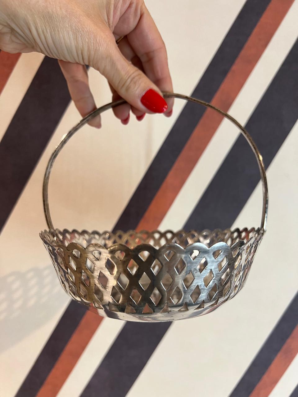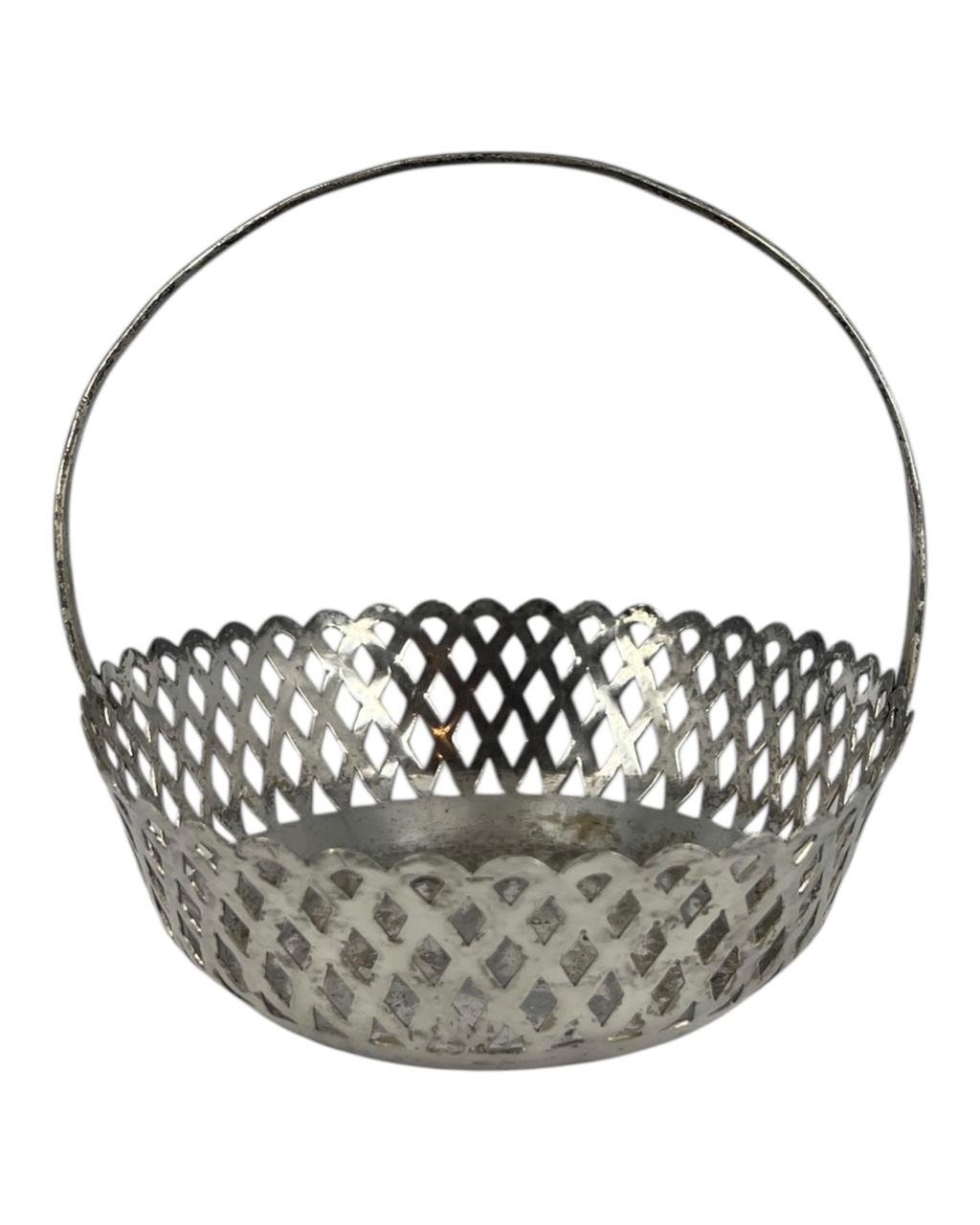 Cesta decorativa em metal prateado com alça, apresenta um trabalho vazado ou "rendado" na parte da cesta, e uma alça para transporte. Pode ser utilizada como fruteira, porta-pães, centro de mesa, ou para outros fins decorativos.