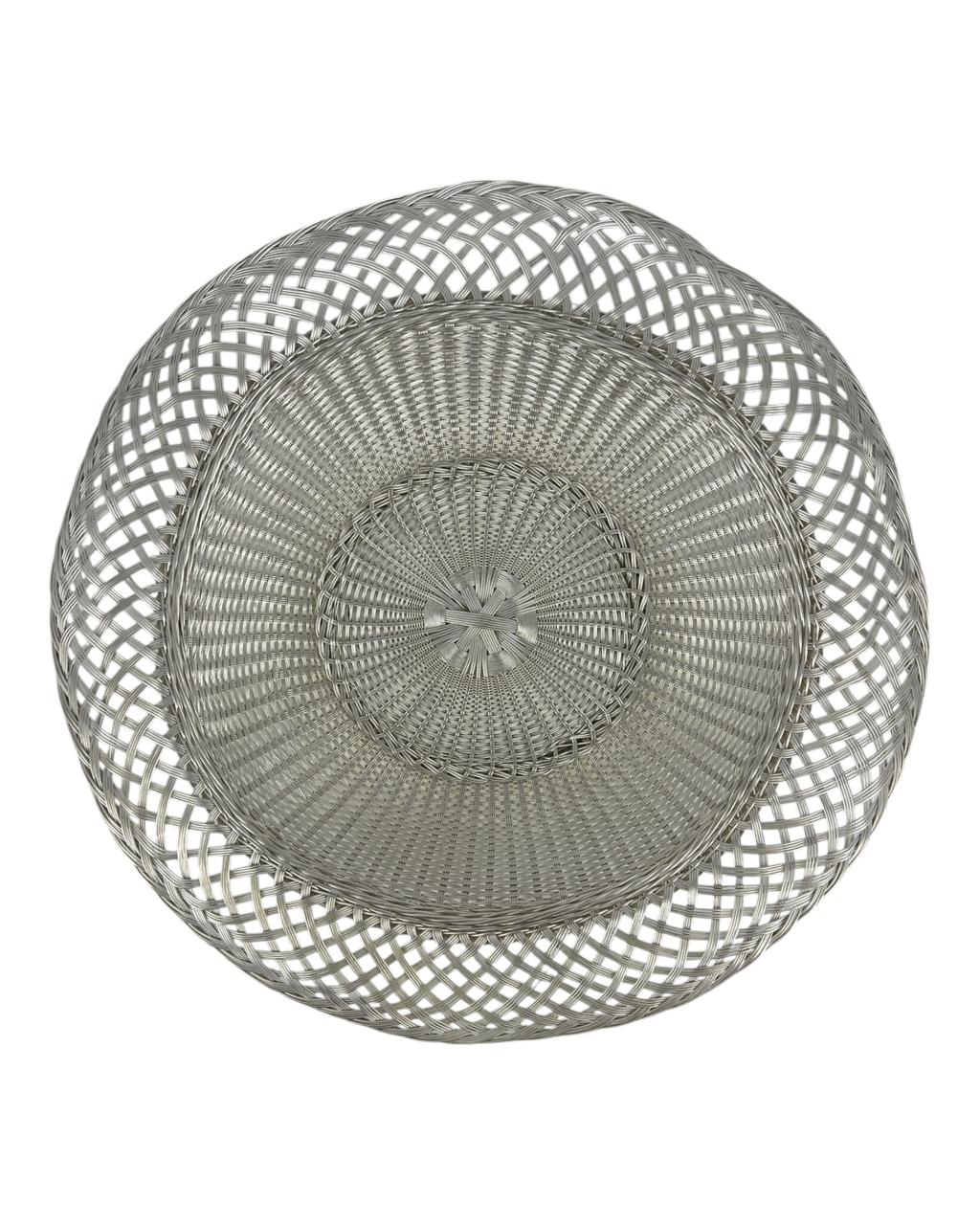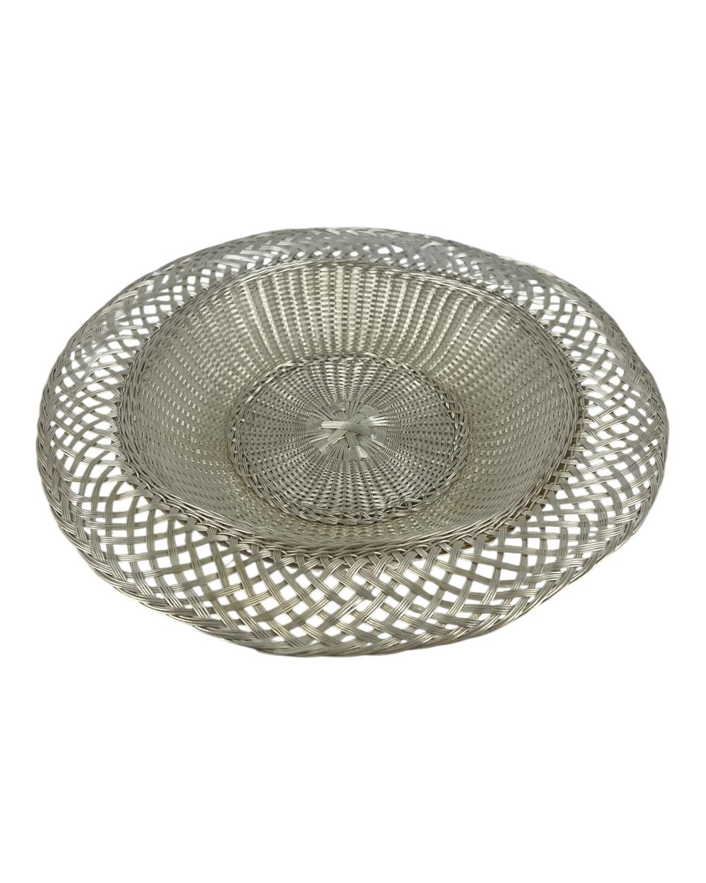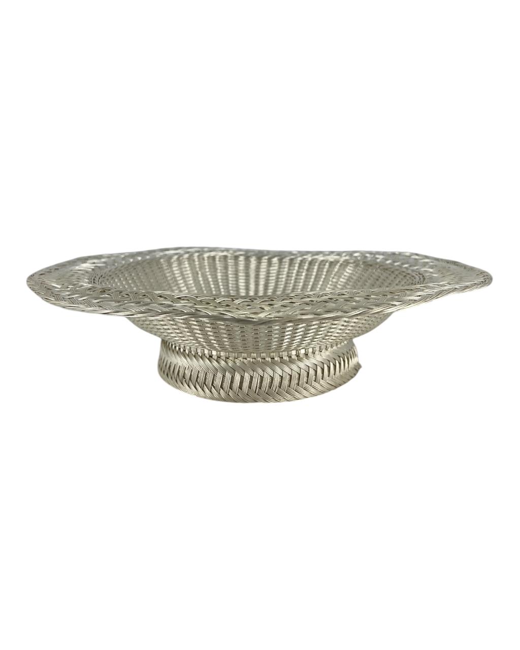 A cesta é feita de metal, banhada a prata.O Design intrincado e a forma da cesta indicam um estilo clássico, um design que remete à era vitoriana, com padrões vazados e bordas decoradas.