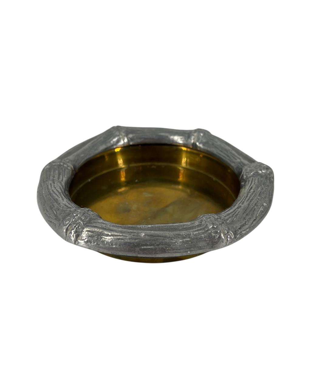 O cinzeiro é feito de metal, com a parte interna em um tom dourado. O design elaborado da borda remete a um estilo vintage clássico, sendo encontrado em peças antigas e decorativas, muitas vezes utilizadas como porta-objetos ou centros de mesa além da função original de cinzeiro.