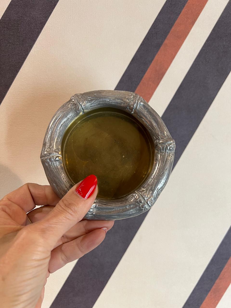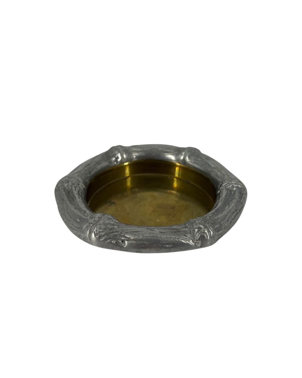O cinzeiro é feito de metal, com a parte interna em um tom dourado. O design elaborado da borda remete a um estilo vintage clássico, sendo encontrado em peças antigas e decorativas, muitas vezes utilizadas como porta-objetos ou centros de mesa além da função original de cinzeiro.