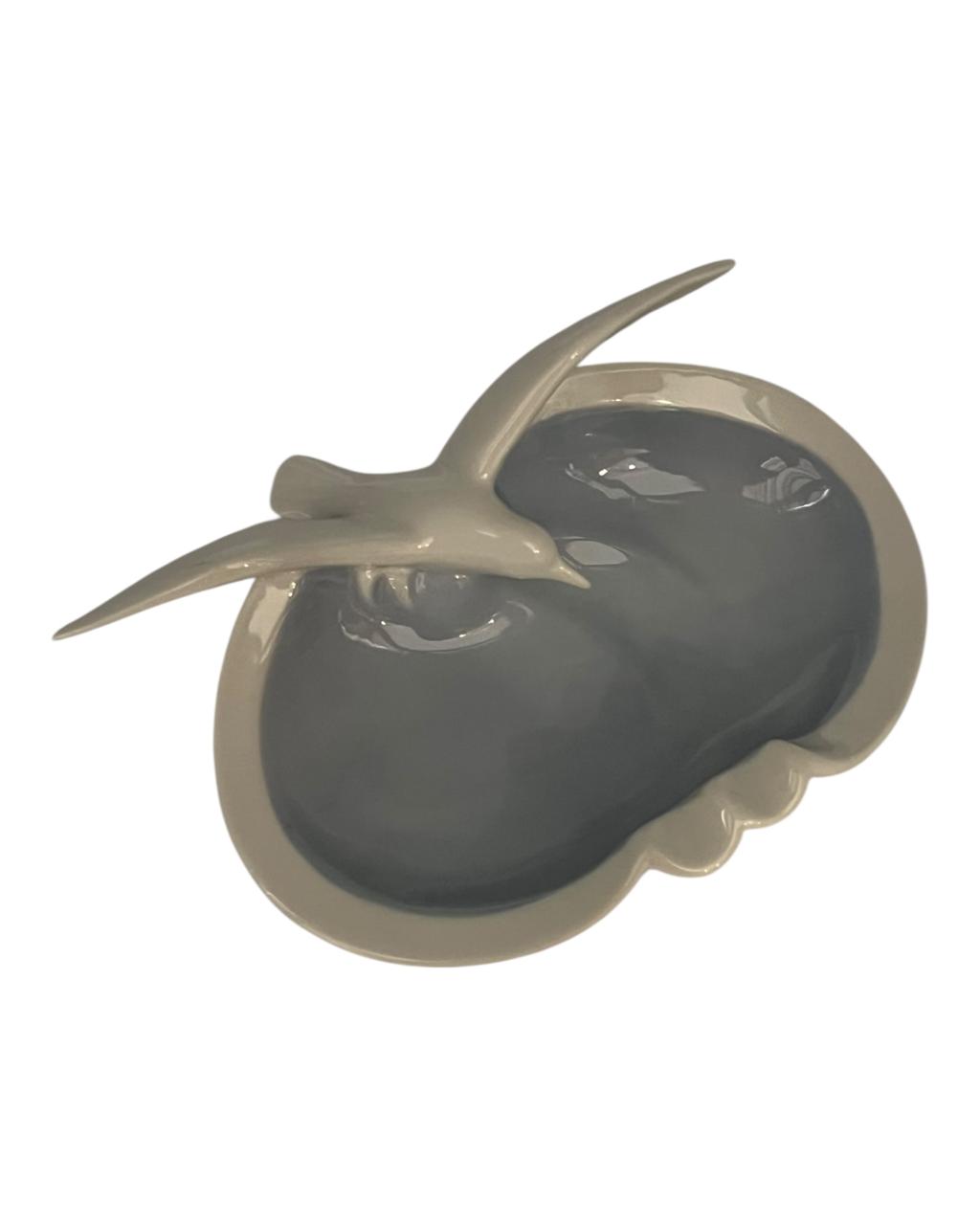 O cinzeiro é feito de porcelana branca com a parte interna da concha em um tom de azul claro, remetendo ao oceano. A figura da gaivota está em porcelana branca nítida. Fabricado na Alemanha Ocidental pela Gerold Porzellan Bavaria, provavelmente entre as décadas de 1950 e 1970.