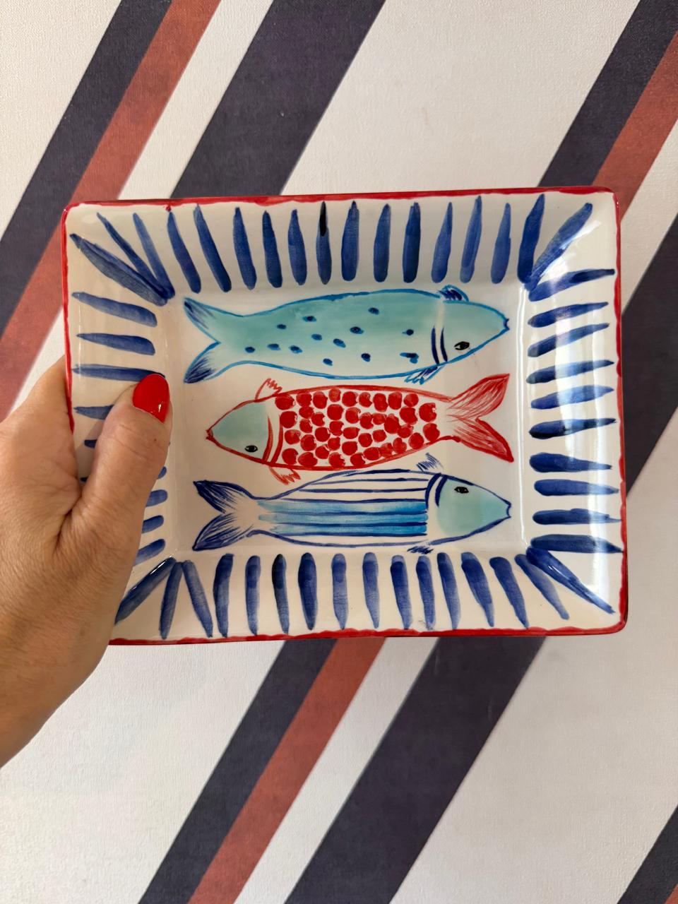 Adicione um toque de charme náutico e artesanal ao seu espaço com este cinzeiro retangular exclusivo. Feito em cerâmica de alta qualidade, a peça apresenta uma borda vermelha vibrante e ilustrações encantadoras de três peixes pintados à mão no centro. Náutico, artesanal, perfeito para áreas externas, varandas ou como peça decorativa interna para amantes do mar, ideal como um cinzeiro estiloso ou para outros pequenos usos decorativos. Cada peça é moldada e pintada à mão garantindo um acabamento único e de alta qualidade.