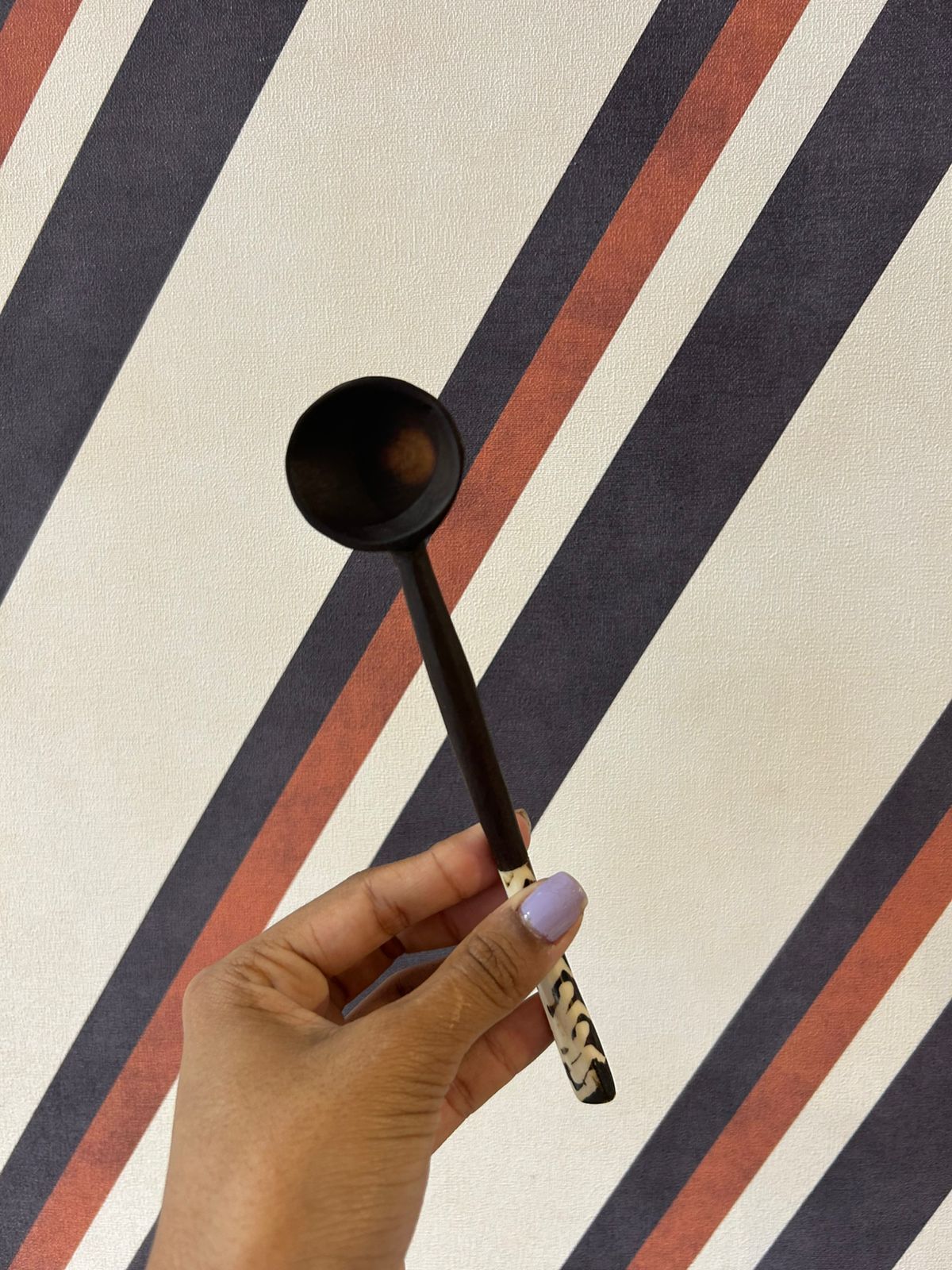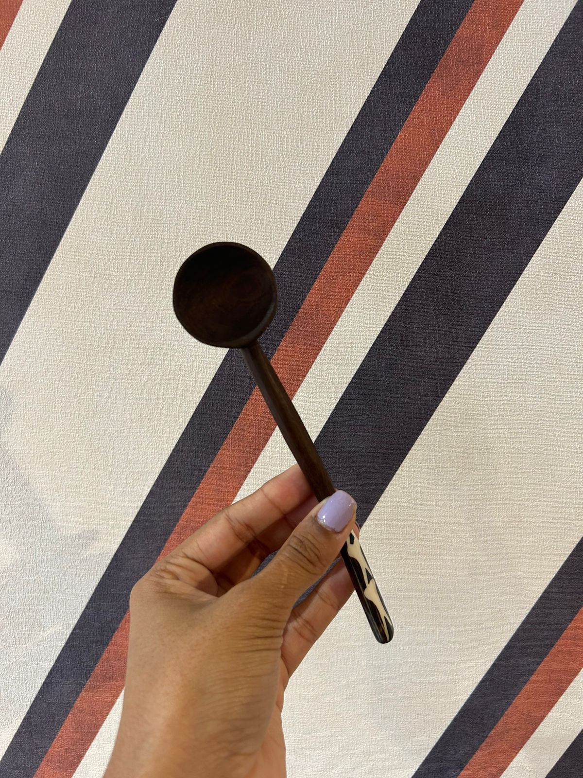 Seu formato alongado e equilibrado proporciona conforto no uso e versatilidade na aplicação. O detalhe artesanal no cabo evidencia o trabalho manual e confere personalidade, transformando a colher em um objeto funcional e decorativo ao mesmo tempo.