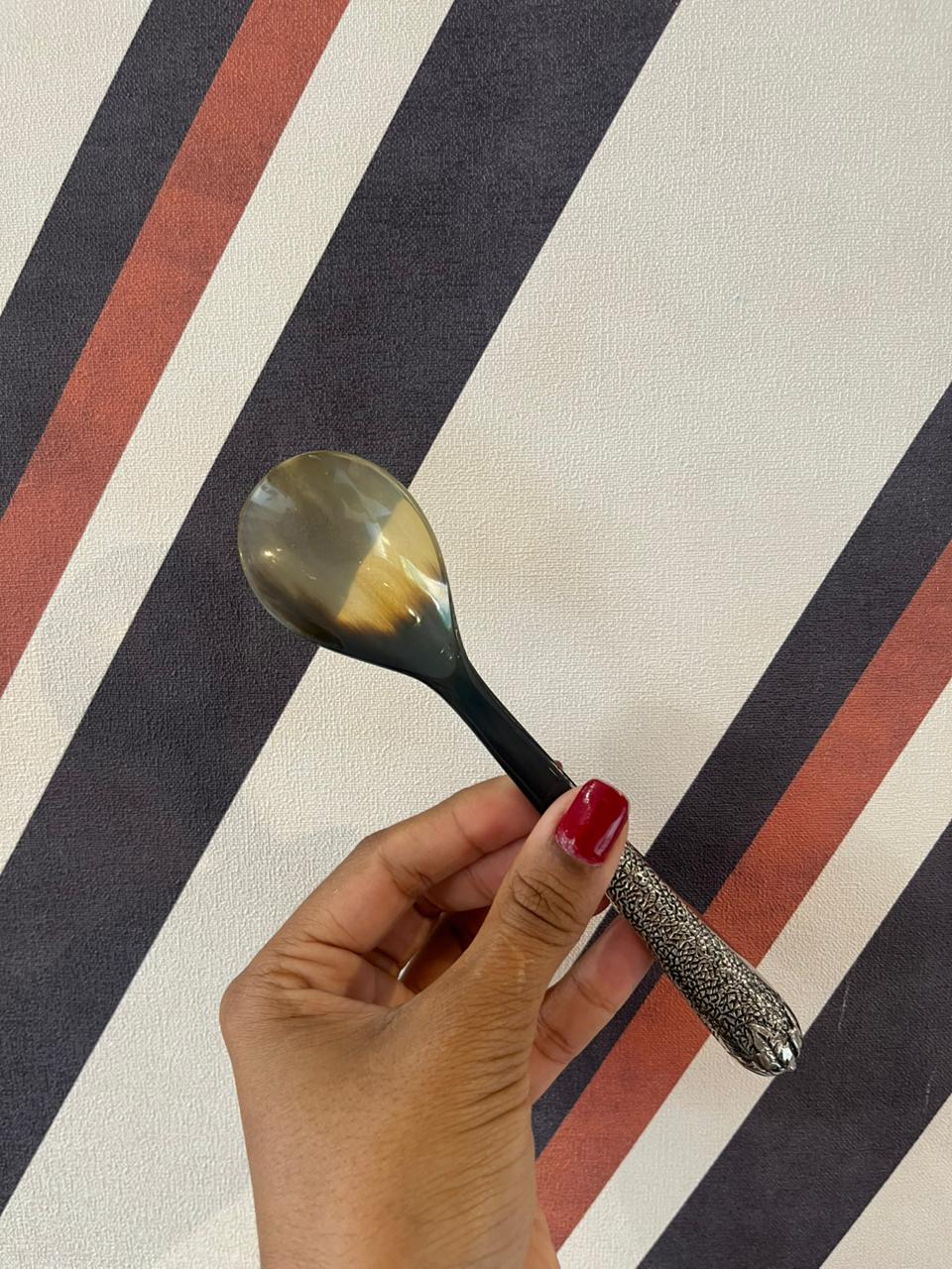Leve mais sofisticação e autenticidade para o seu dia a dia com esta colher feita em chifre natural, combinada com um elegante cabo em metal. Cada peça possui tonalidades e desenhos únicos, resultado das variações naturais do material, tornando cada colher exclusiva.