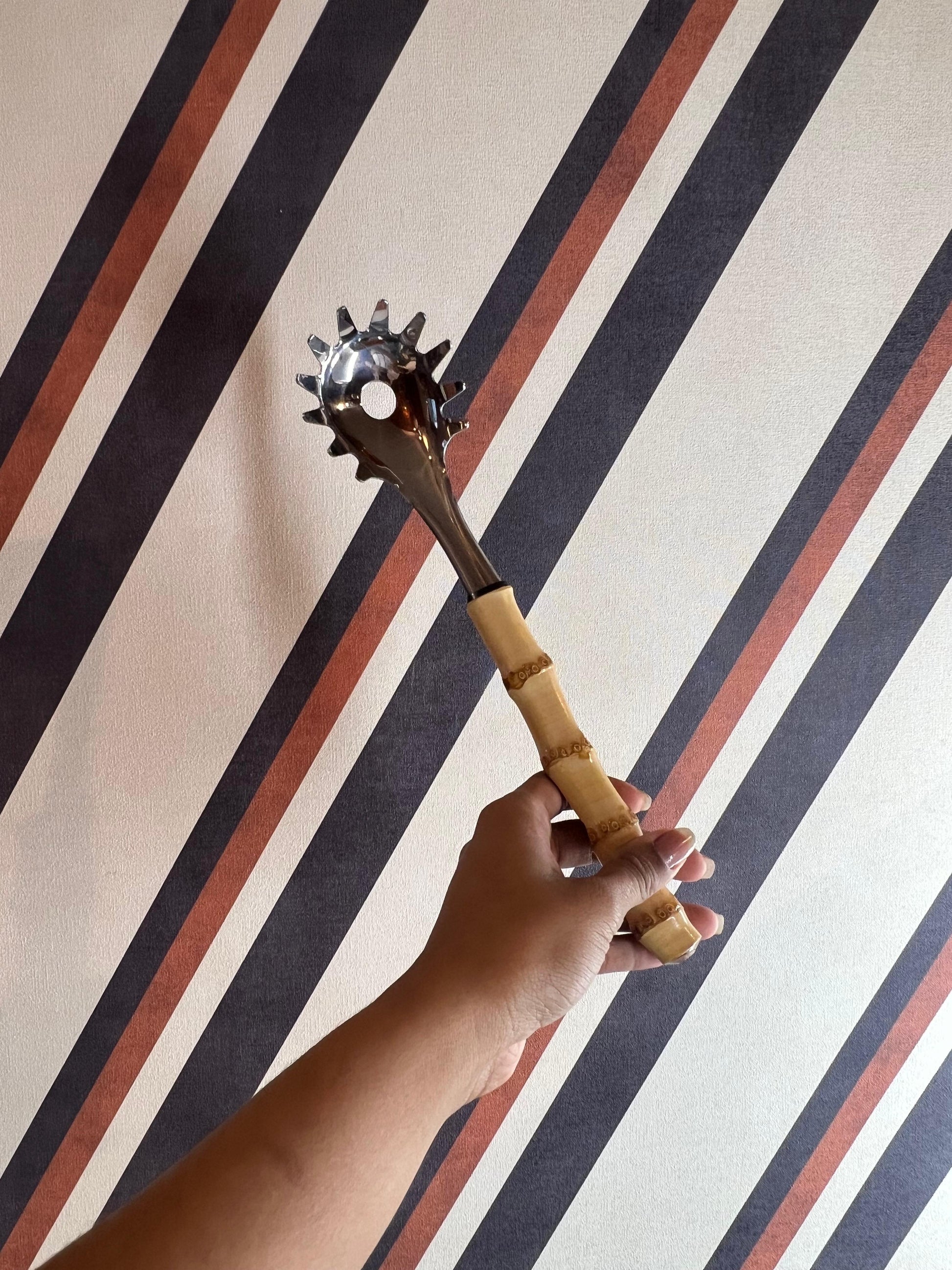Adicione um toque de elegância e funcionalidade à sua cozinha com este pegador de macarrão premium, combinando a durabilidade do aço inoxidável e o charme natural do bambu, este utensílio é perfeito para servir suas massas favoritas com praticidade e estilo. Além de prático, o uso de materiais sustentáveis como o bambu traz um apelo ecológico e sofisticado para a decoração da sua mesa e cozinha.