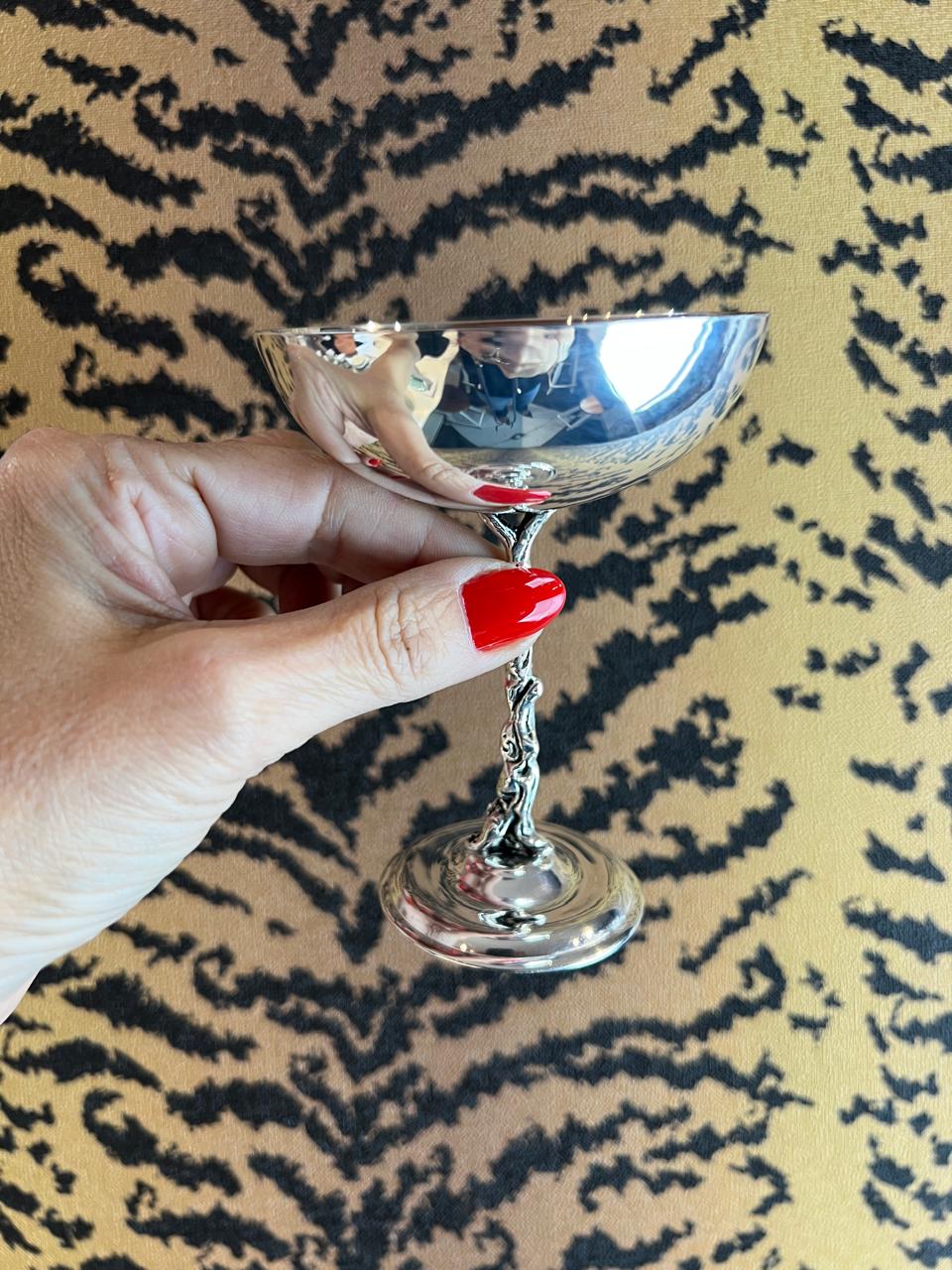 As taças apresentam um design elegante com um bojo arredondado e uma haste que imita um galho ou tronco retorcido, conferindo um toque artístico e naturalista.
