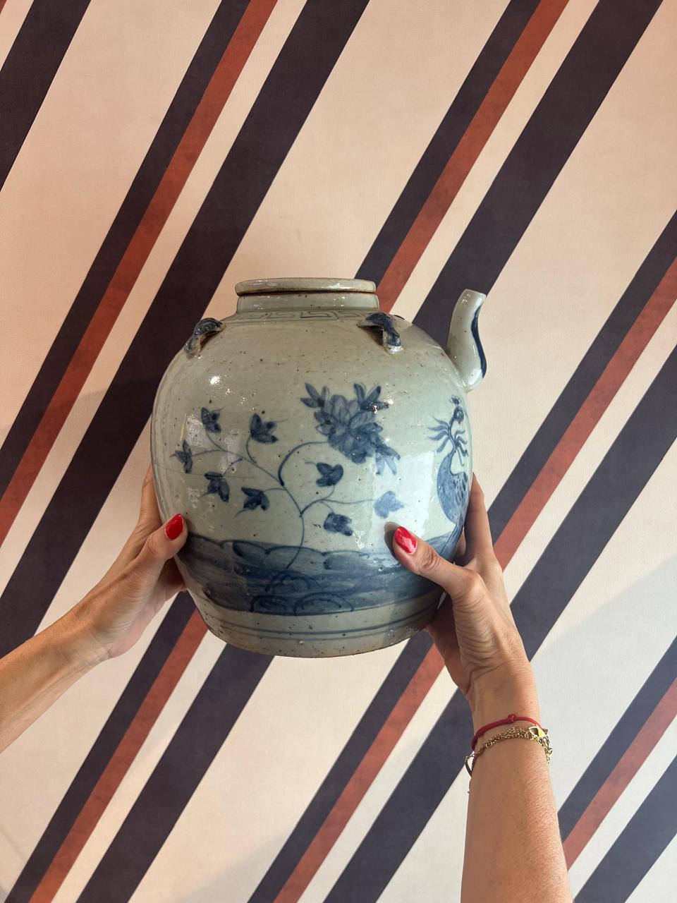 Decanter em porcelana chinesa azul e branca é uma peça de cerâmica de forma arredondada e corpo robusto. É decorada com um pássaro, possivelmente um pavão, pintado à mão com pigmento azul cobalto sob o esmalte, uma técnica de decoração amplamente utilizada na China a partir do século XIV.