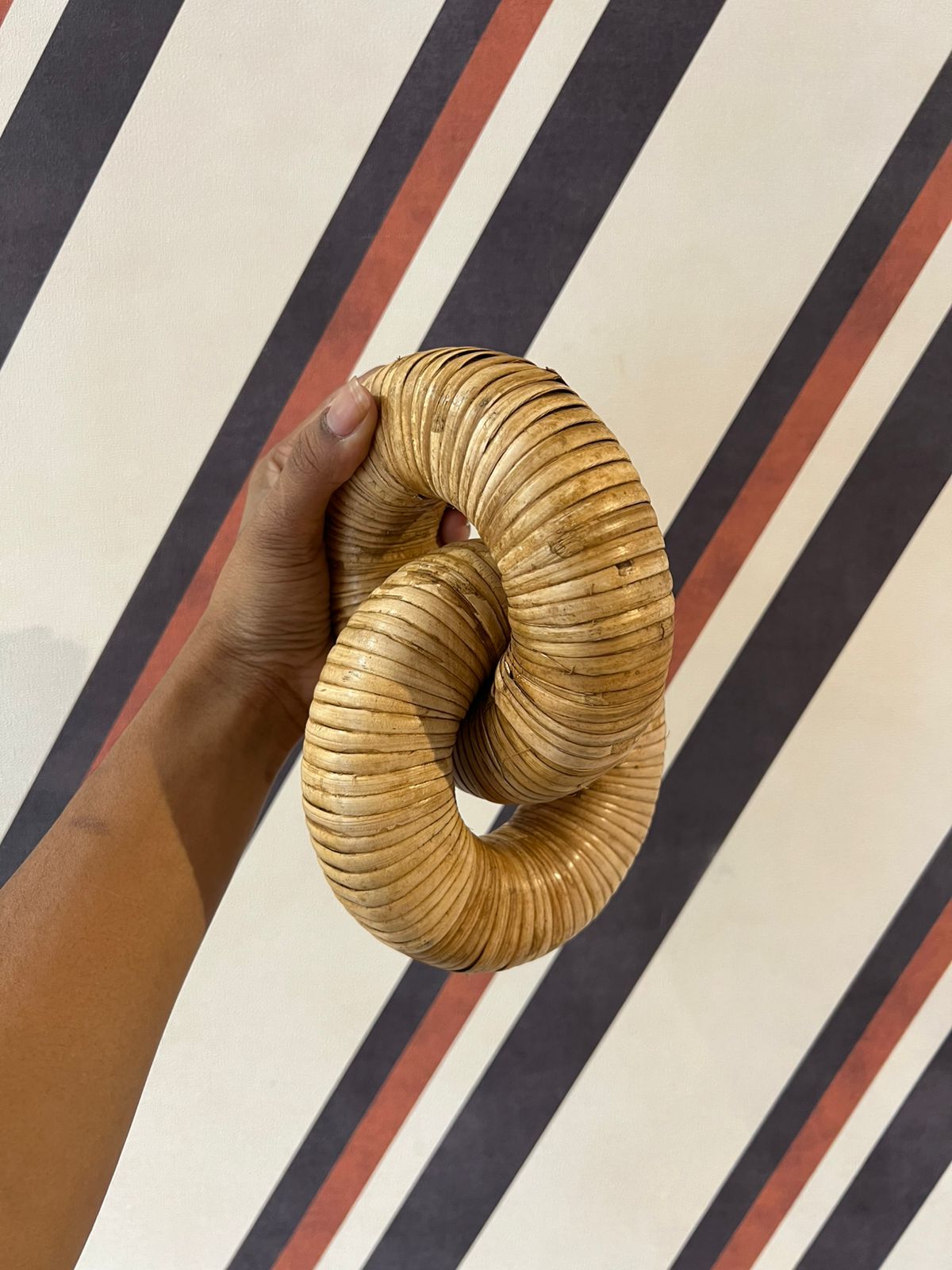 Este elo decorativo artesanal é uma peça de design orgânico que traduz equilíbrio, continuidade e conexão. Produzido manualmente em fibra natural, seu formato entrelaçado cria movimento e leveza visual, enquanto a textura marcada e o acabamento natural valorizam a matéria-prima e tornam cada peça única.