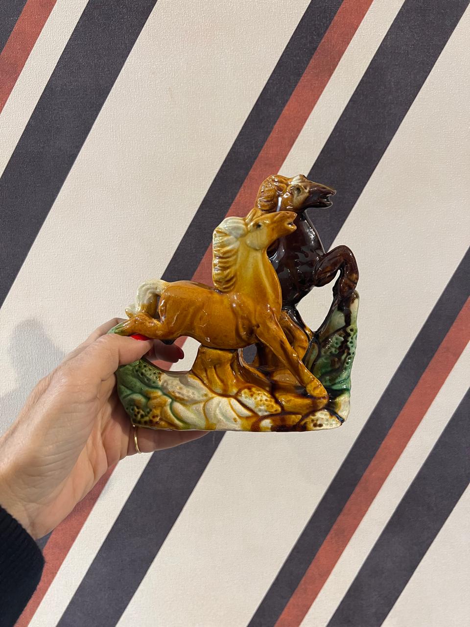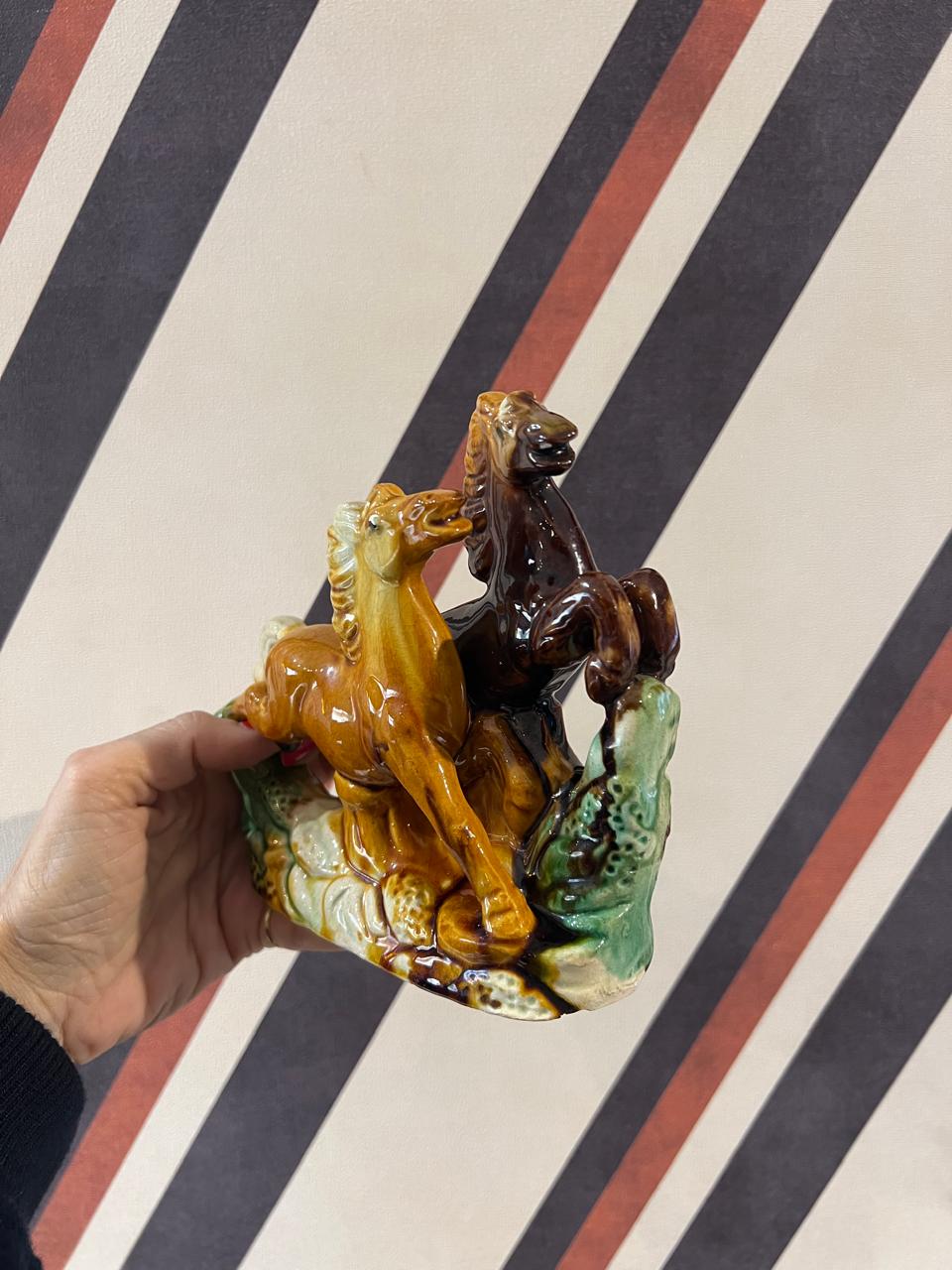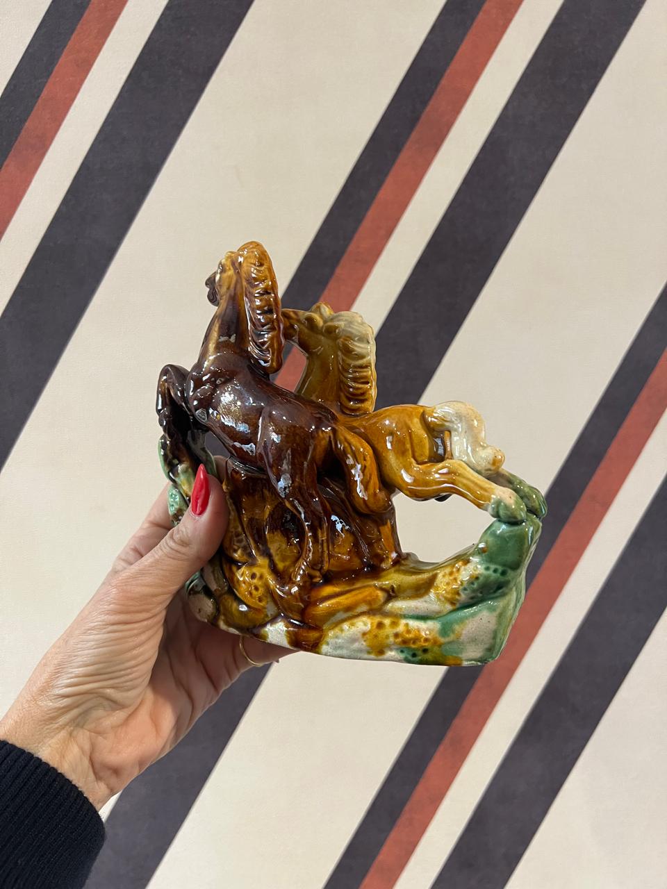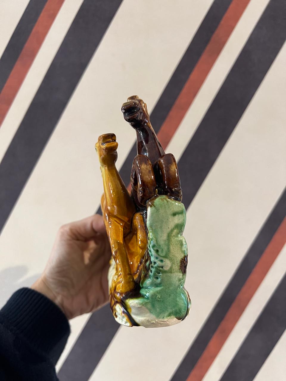 Estatueta de cerâmica que representa um cavalos de guerra da Dinastia Tang, um estilo artístico que floresceu na China entre os anos 618 e 907 d.C.. Estas figuras são conhecidas por sua técnica de "sancai" (três cores), que utiliza esmaltes coloridos em tons de ambar, verde e creme muitas vezes com um efeito de gotejamento.
