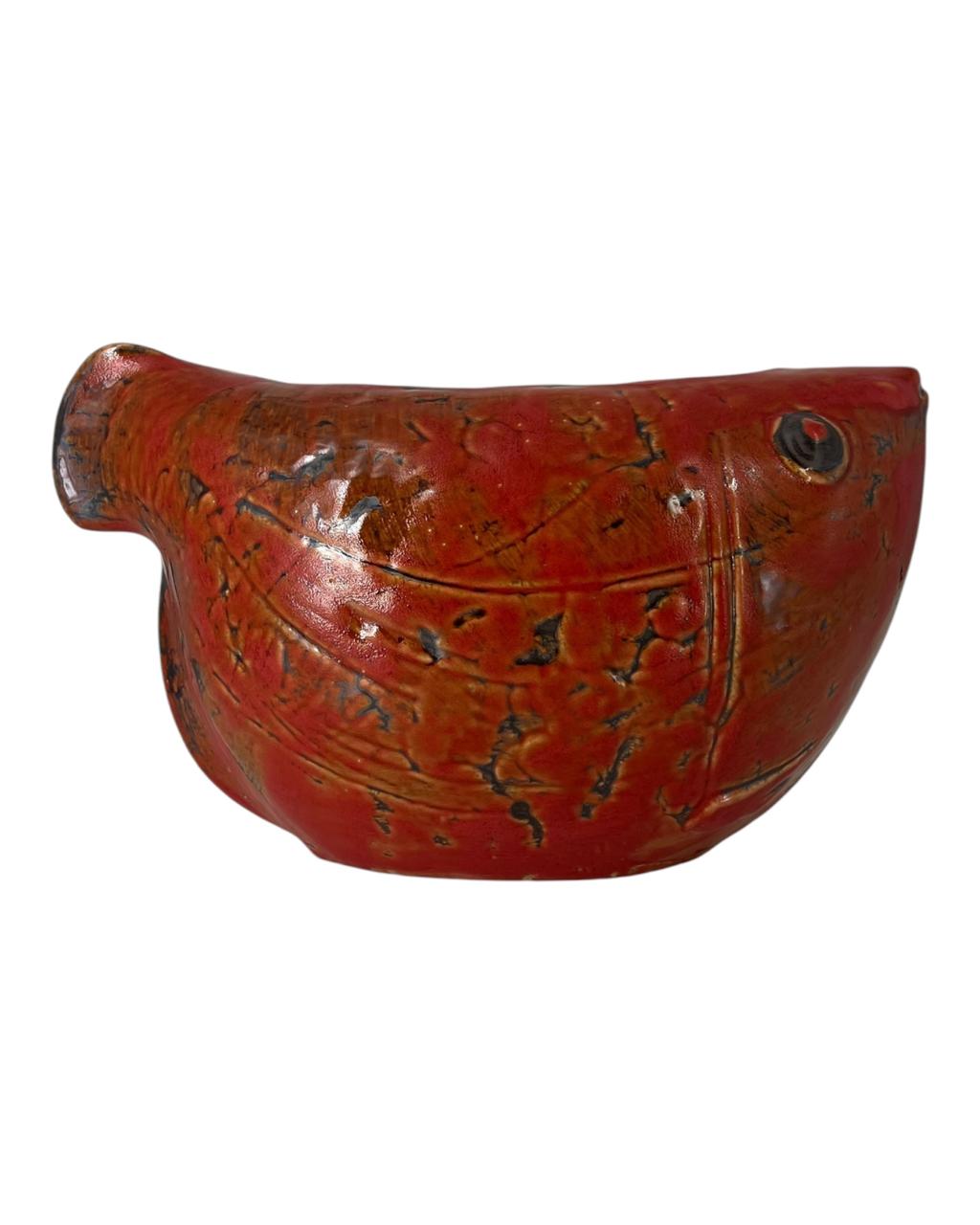 Escultura decorativa em cerâmica em forma de peixe em faiança esmaltada, possivelmente utilizada como vaso ou floreiro. Ideal para decoração de ambientes com temas marinhos ou rústicos, podendo abrigar pequenas plantas ou flores secas.