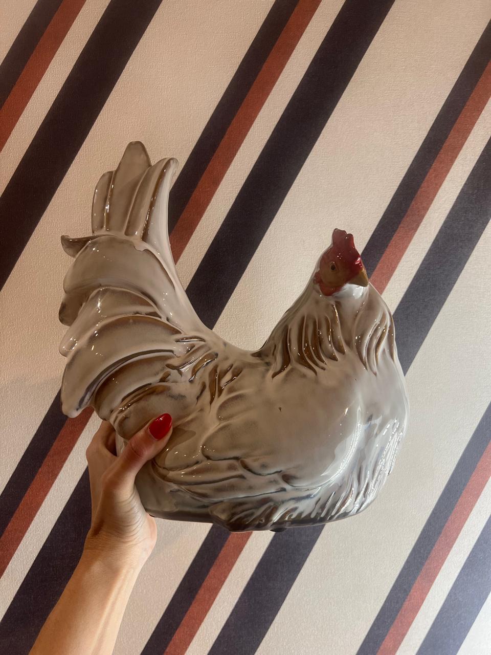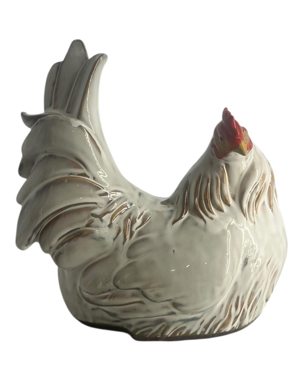 A peça é esculpida com linhas elegantes e detalhes intrincados nas penas, que dão vida à forma da galinha. A superfície possui um acabamento em esmalte branco suave, realçado por sutis detalhes dourados nas penas, conferindo um toque de charme rústico, a crista e as barbelas são vermelhas vibrantes, criando um contraste marcante. É feita de cerâmica, com um design artesanal e detalhado.
