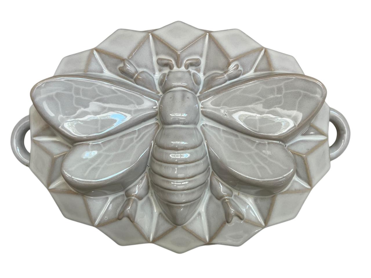 Forma decorativa em cerâmica com formato de abelha em relevo.