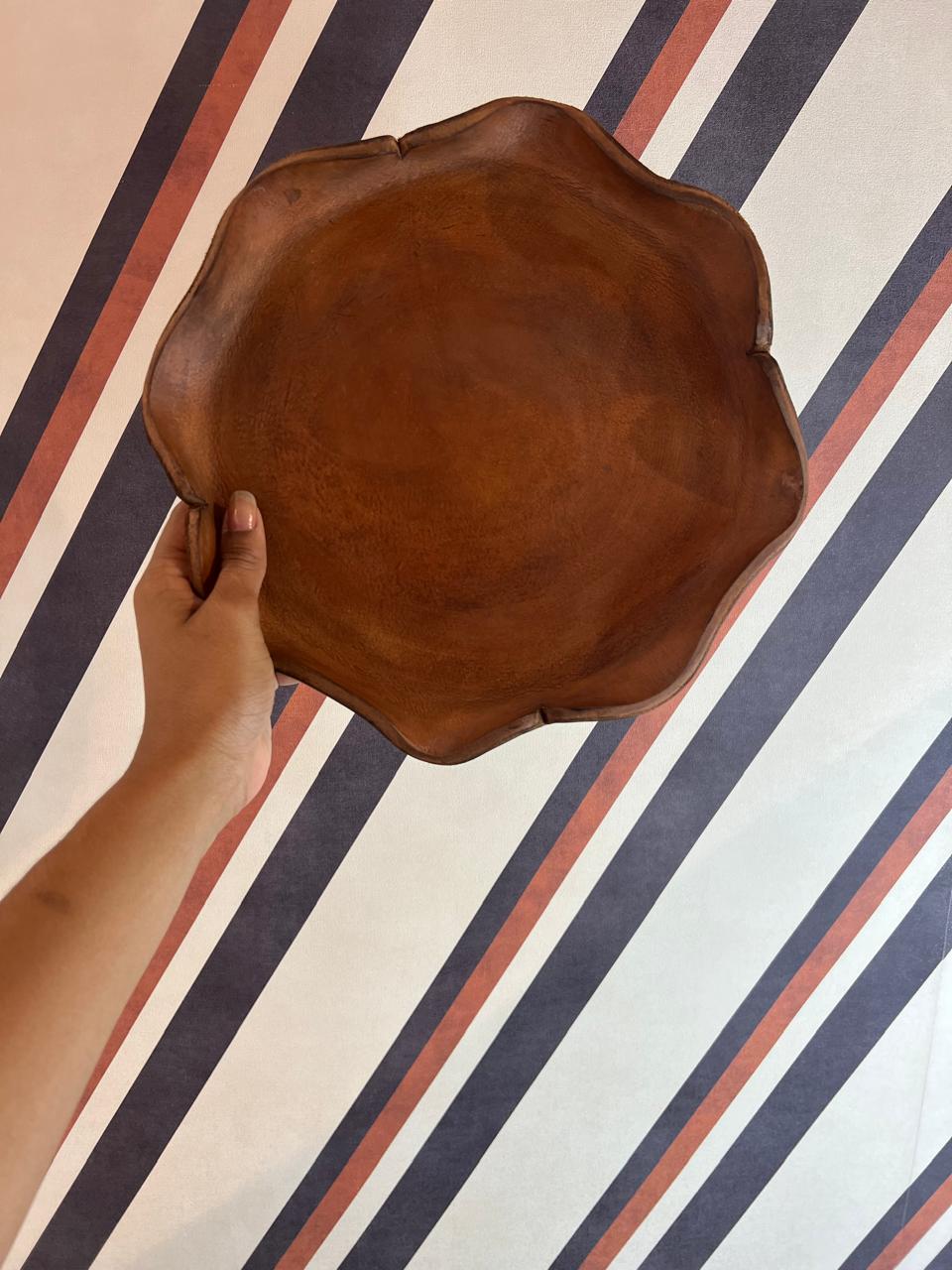 O formato sinuoso das bordas imita as curvas suaves das pétalas, proporcionando um visual sofisticado e artesanal que se destaca em qualquer ambiente, confeccionada em couro rígido de alta qualidade, a gamela apresenta uma textura tátil e um tom marrom quente, que evoca a beleza crua e duradoura dos materiais naturais. Ideal como um elegante centro de mesa, um prático porta-objetos para chaves e carteiras na entrada, ou até mesmo como um charmoso recipiente para servir petiscos secos ou frutas.