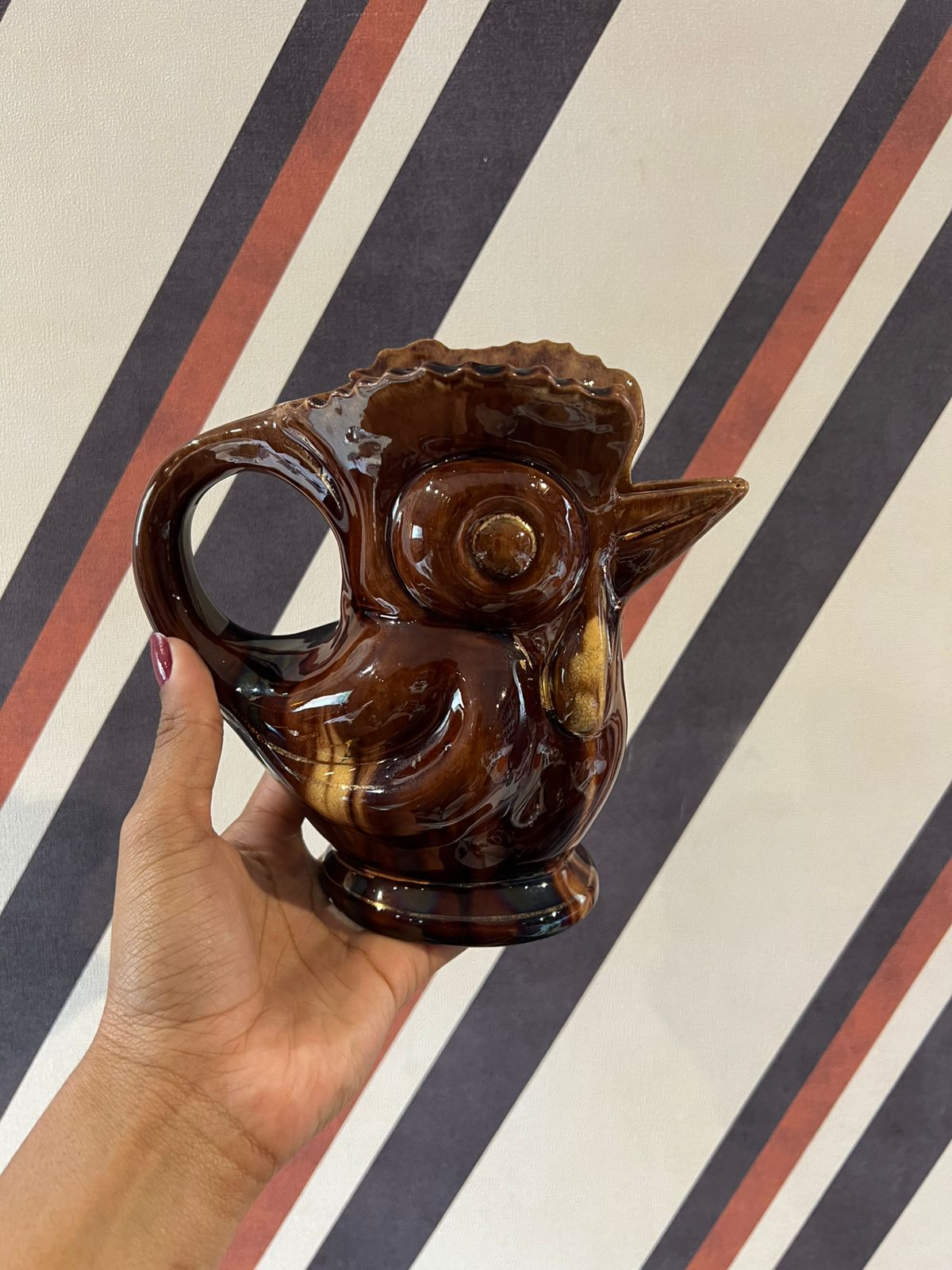 Dê um toque de nostalgia e personalidade à sua mesa com esta belíssima jarra vintage em formato de galo. Com um brilho vitrificado intenso e tonalidade café/âmbar, esta peça é um exemplo clássico da cerâmica decorativa de meados do século XX.